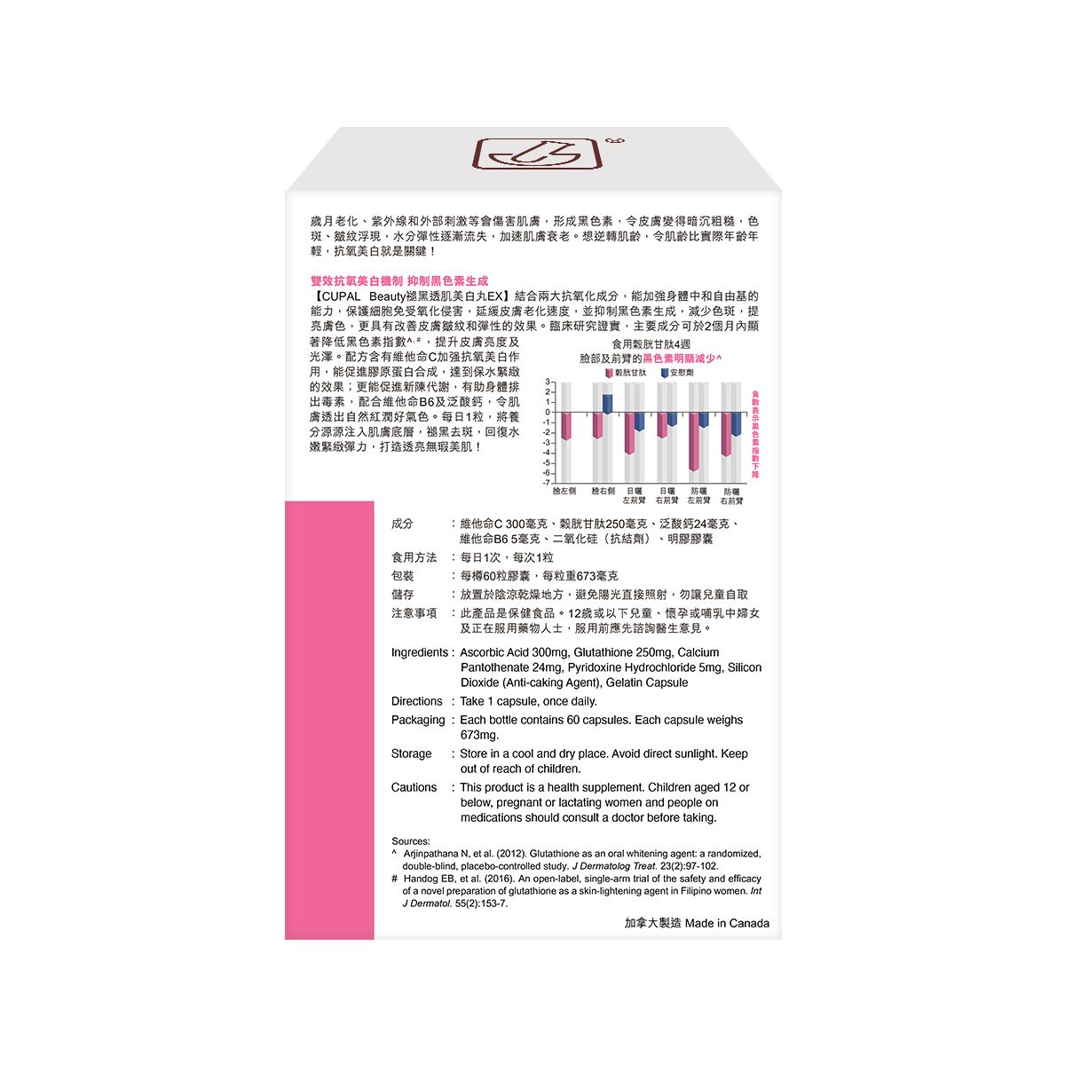 結合兩大抗氧化成分,能加強身體中和自由基的能力,保護細胞免受氧化侵害,延緩皮膚老化速度,並抑制黑色素生成,減少色斑,提亮膚色,更具有改善皮膚皺紋和彈性的效果。臨床研究證實,主要成分可於2個月內顯著降低黑色素指數^,#,提升皮膚亮度及光澤。配方含有維他命C加强抗氧美白作用,能促進膠原蛋白合成,達到保水緊緻的效果;更能促進新陳代謝,有助身體排出毒素,配合維他命B6及泛酸鈣,令肌膚透出自然紅潤好氣色。每日1粒,將養分源源注入肌膚底層,褪黑去斑,回復水嫩緊緻彈力,打造透亮無瑕美肌!