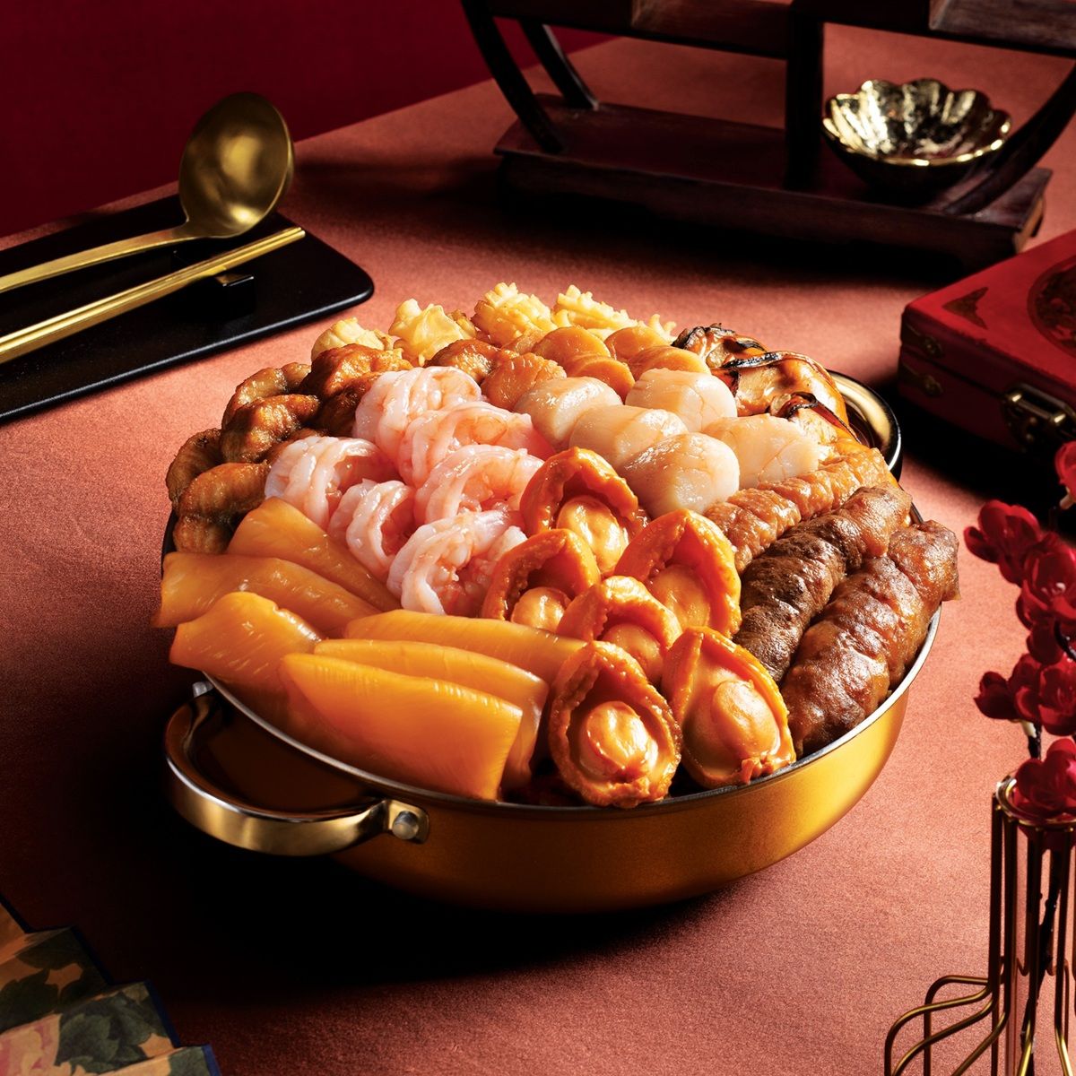 黃金玉參、飽滿鮑魚、名貴花膠、帶子鮮蝦,盡是上等海中食材;配上傳統南乳汁烹調,更能提升海鮮味道,濃郁而不覺膩。講究的擺位,令矜貴鮮味層層相連,18款精選食材盡收黃金精華。共聚佳節時,就以金匙金筷,分享貴氣騰騰的美味祝福。