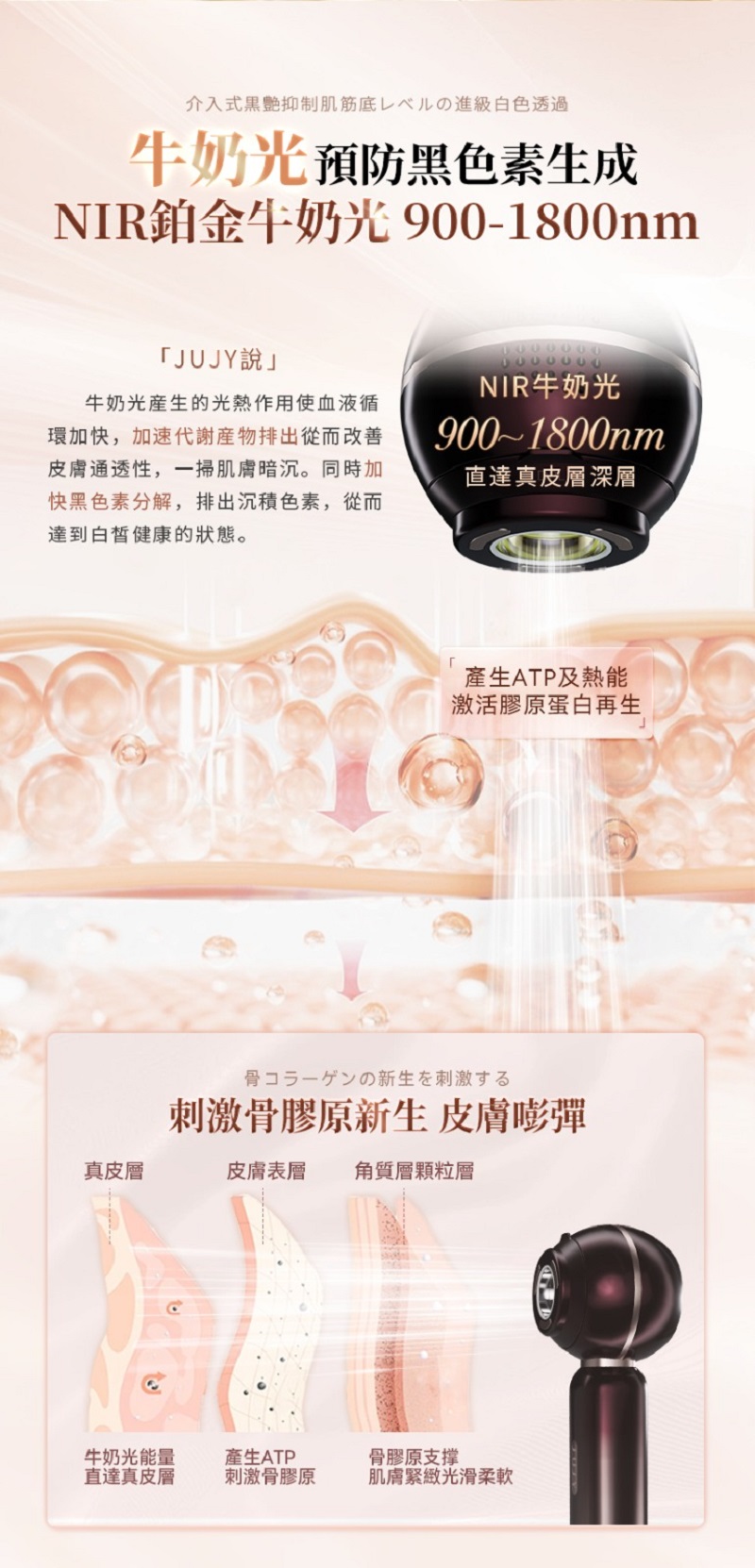 • 900-1800nm深層NIR牛奶光︰重塑膠原纖維、促生深層膠原蛋白,新生肌膚,煥亮全身。