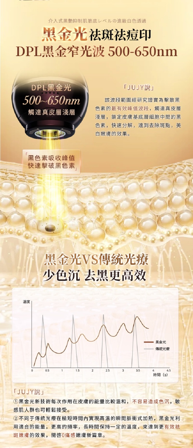 • 500-650nm表層DPL黑金光︰快速擊破分解黑色素,有效淡化斑點,改善皮膚暗沉粗糙。