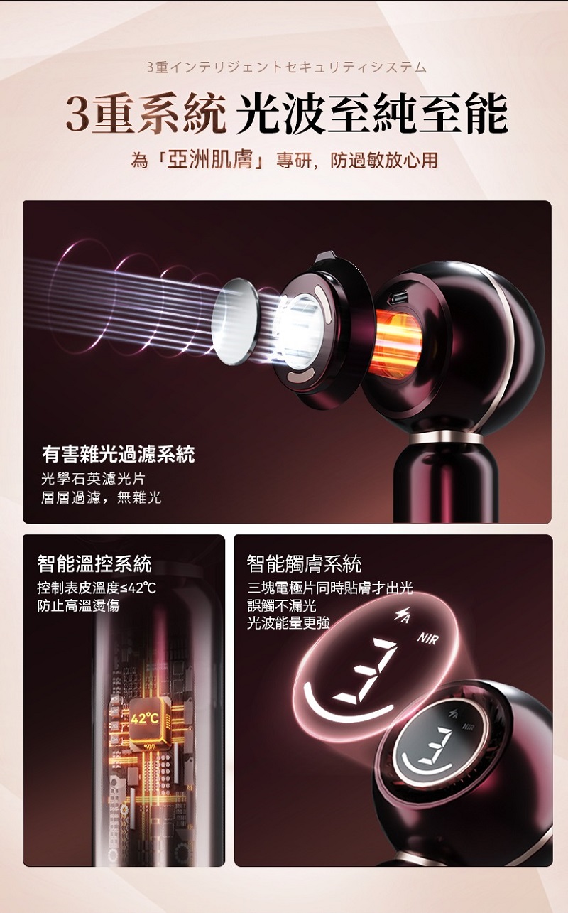 • 有害雜光過濾+智能溫控+智能觸膚系統,3重安全防護,不過敏放心用。
