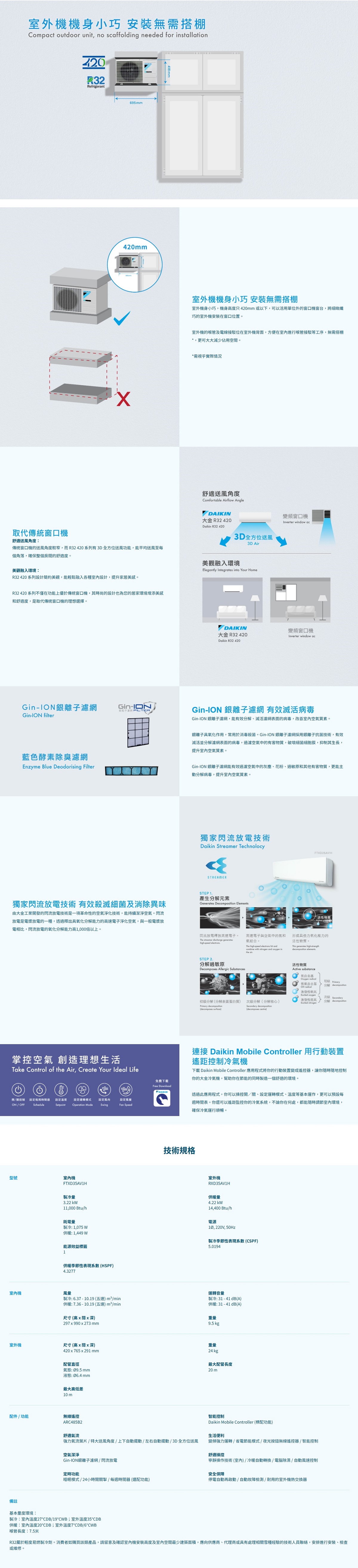 大金 R32 420 系列,室外機身小巧,機身高度只有 420mm 或以下,適合香港窄細窗台。