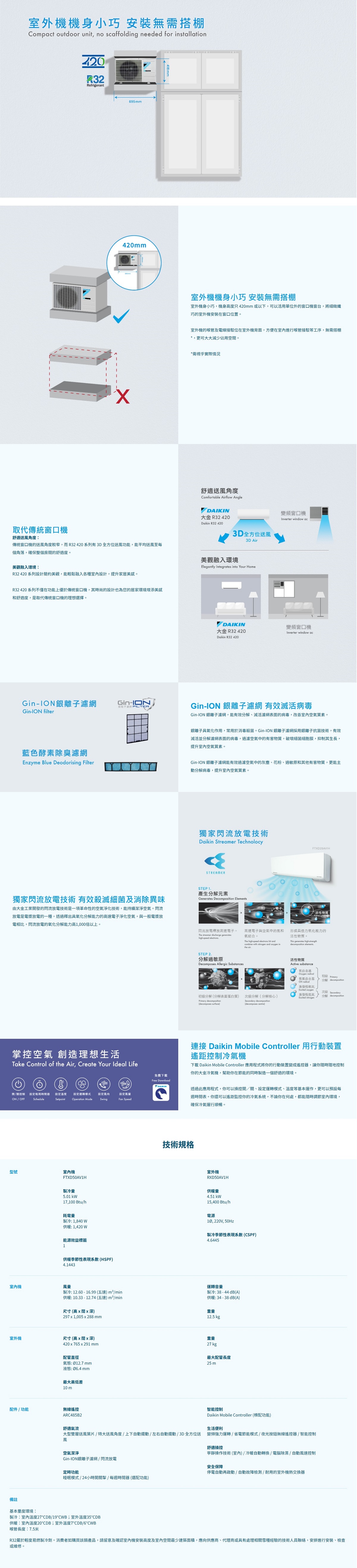 大金 R32 420 系列,室外機身小巧,機身高度只有 420mm 或以下,適合香港窄細窗台。