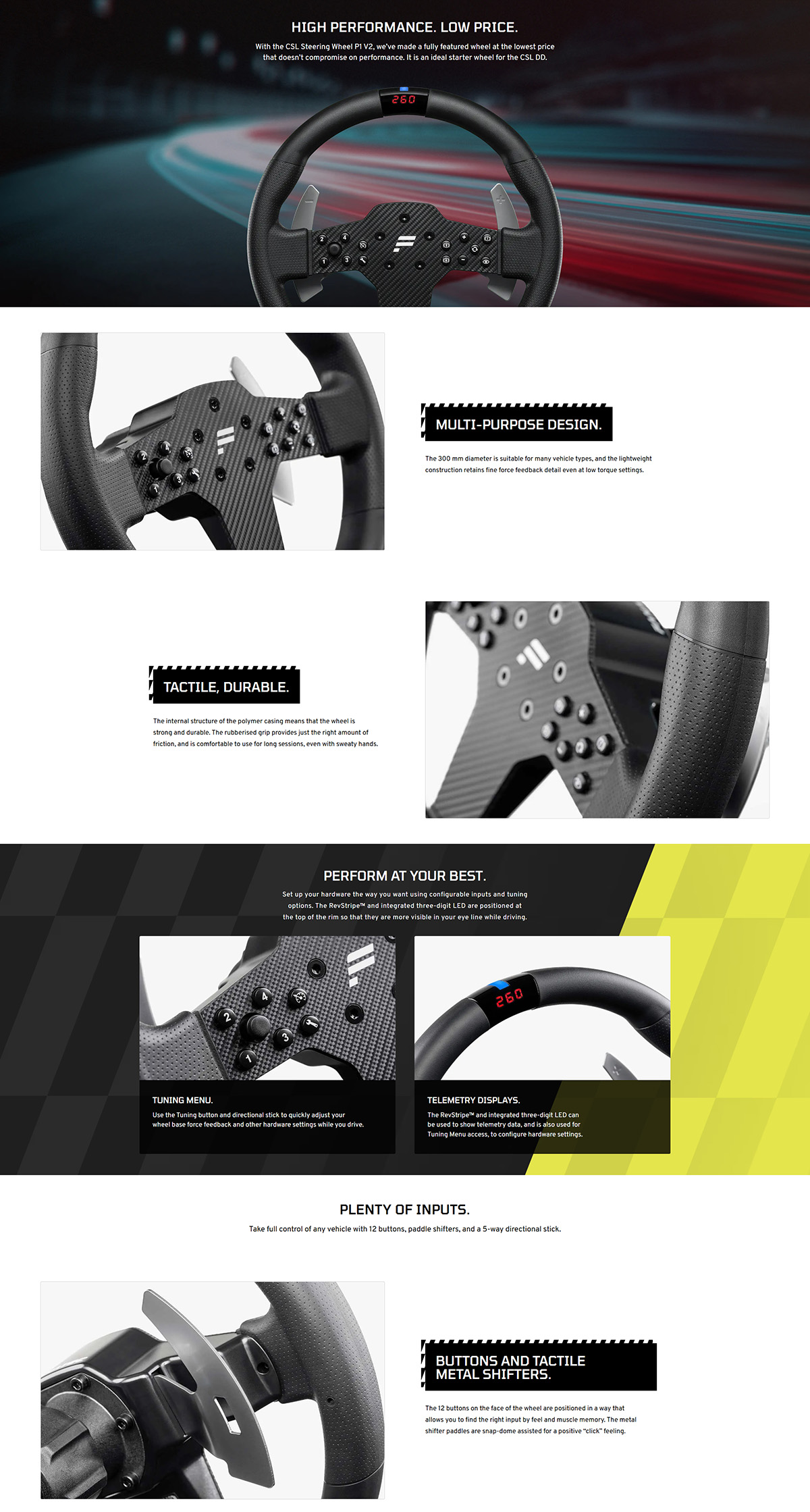 CSL方向盤 P1 V2 以最低價格打造出功能完備的方向盤,性能毫不妥協。它是 CSL DD 的理想入門方向盤。
