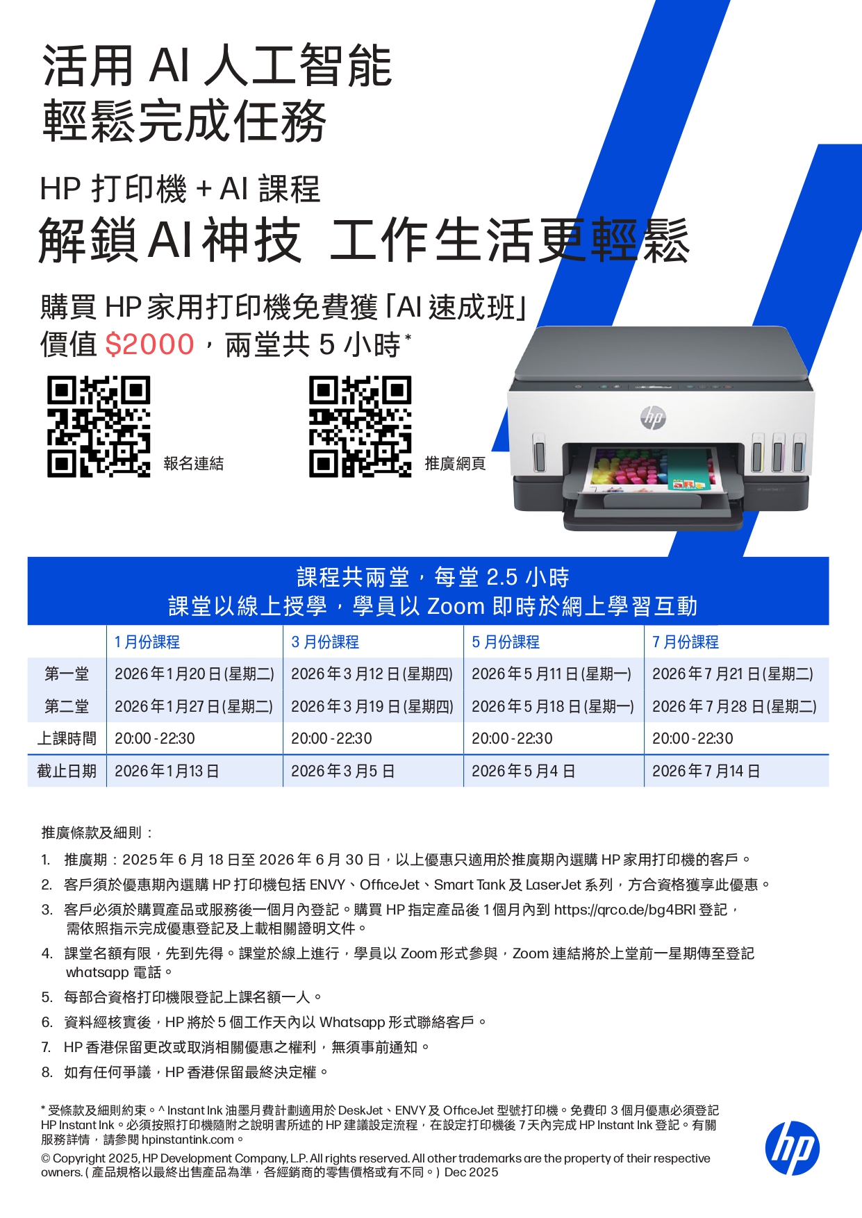 [2] 須下載 HP Smart 應用程式。有關本機打印要求的詳情,請參閱 www.hp.com/go/mobileprinting。特定功能/軟件僅能使用英語,並且桌面電腦與手機應用程式之間有所不同。或者需要訂閱;並非所有國家/地區都可以訂閱。有關詳細資訊,請參閱 www.hpsmart.com。需要存取互聯網,且必須單獨購買。要獲得全部功能,需要使用 HP 帳戶。應用程式商店可獲得支援的作業系統清單。