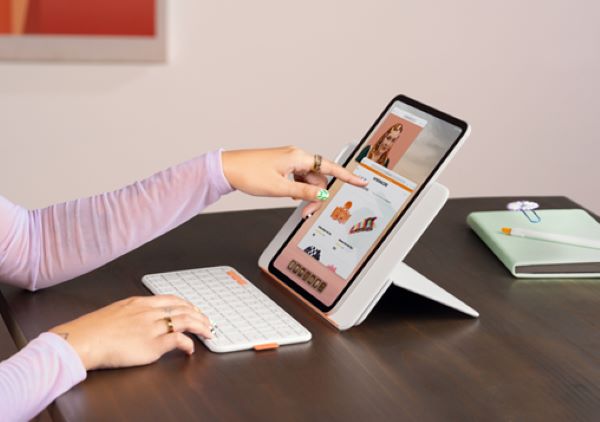 藍牙鍵盤讓您可以以想要的方式精確放置您的環境,並在這個精簡設計的全尺寸鍵盤上享受打字的樂趣。若要輕鬆存放,請將其磁吸在 iPad 保護殼上。