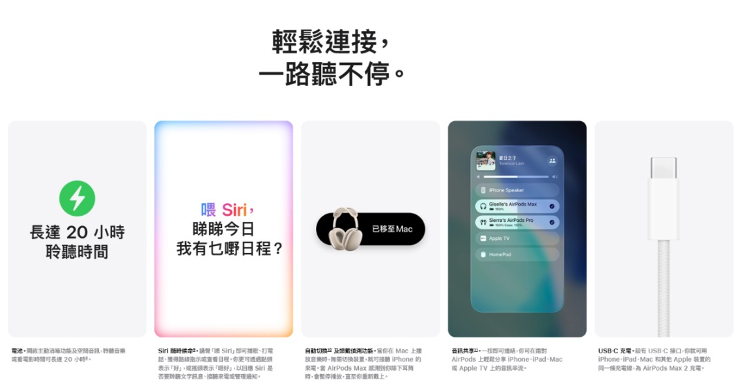 - 配合 USB-C 體驗無損壓縮音訊:透過 USB-C 將 AirPods Max 2 連接到你的裝置,體驗原始錄音的每個細節 。你甚至可以使用同一條充電線,為 AirPods Max 2 和其他 Apple 裝置充電。