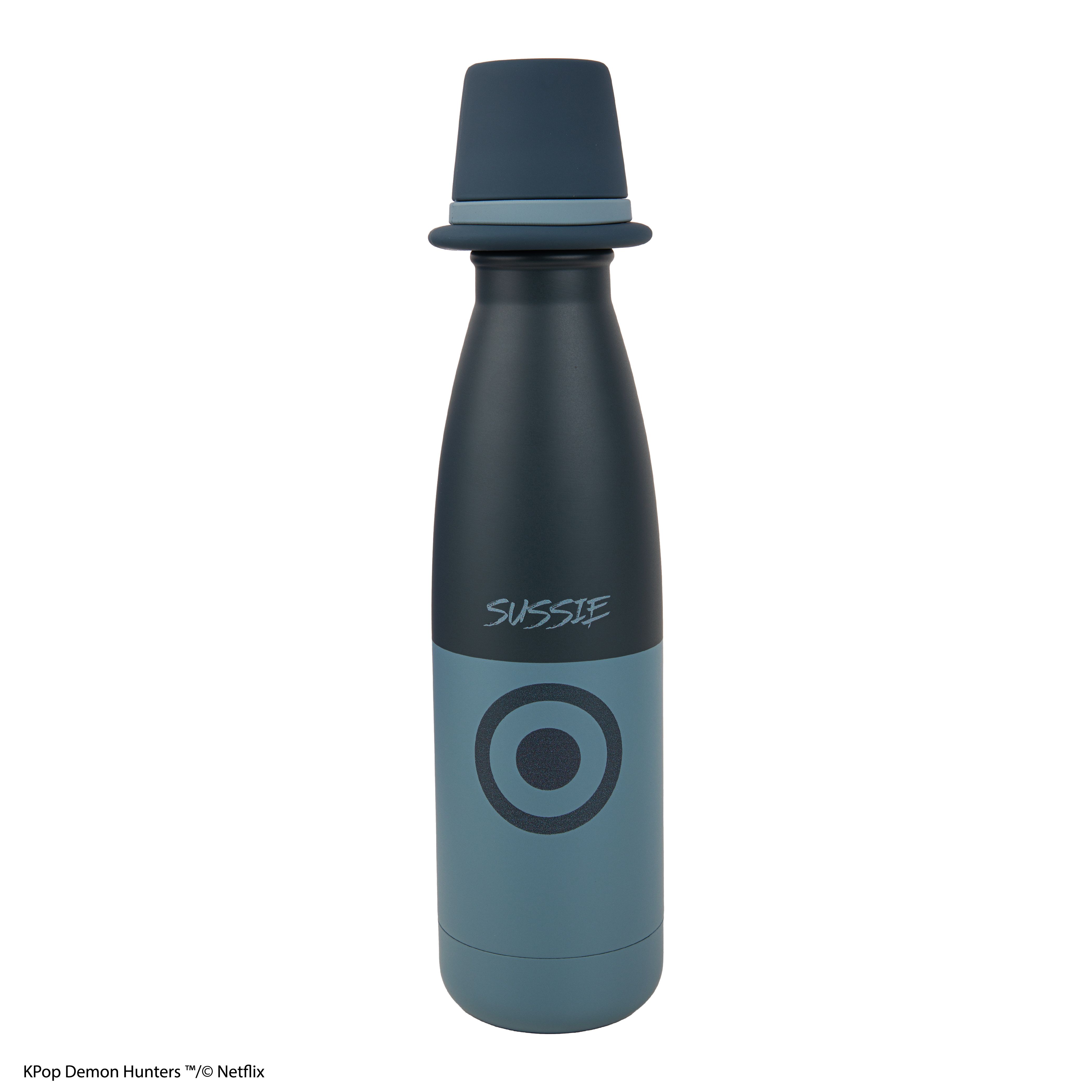 Sussie 水瓶為你日常注入清爽氣息。設計靈感源自她的暗黑獵人風格,深海軍藍與灰藍配色搭配亮眼的黃色圓形細節,瓶蓋更融入她標誌性的高帽輪廓。輕巧實用,同時充滿神秘的團隊精神,並印有 K-Pop Demon Hunters 標誌與 Sussie 名字,細節感十足。