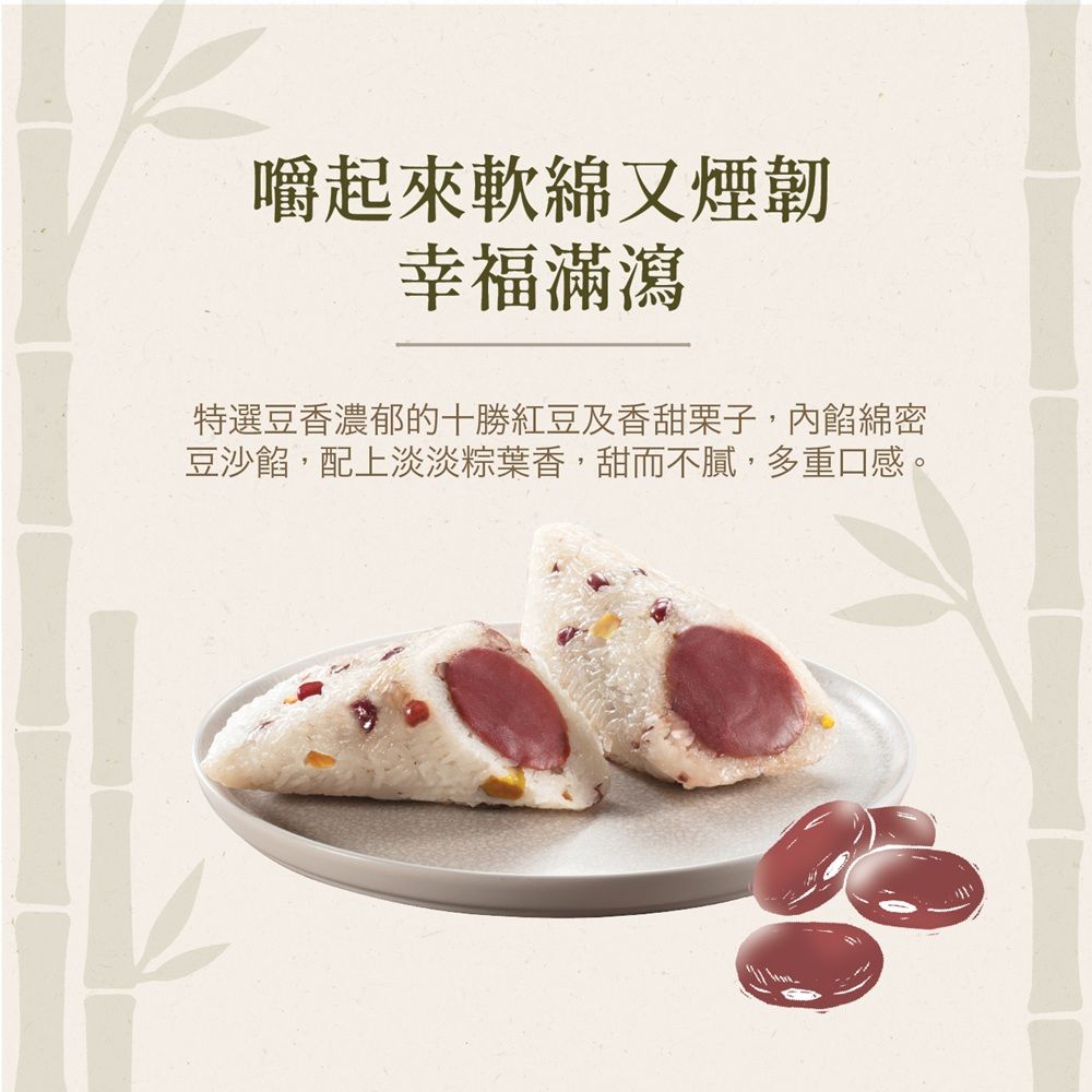 特選豆香濃郁的十勝紅豆及香甜栗子,內餡綿密豆沙餡,配上淡淡粽葉香,嚼起來軟綿又煙韌,層次豐富,甜而不膩,多重口感,幸福滿瀉。