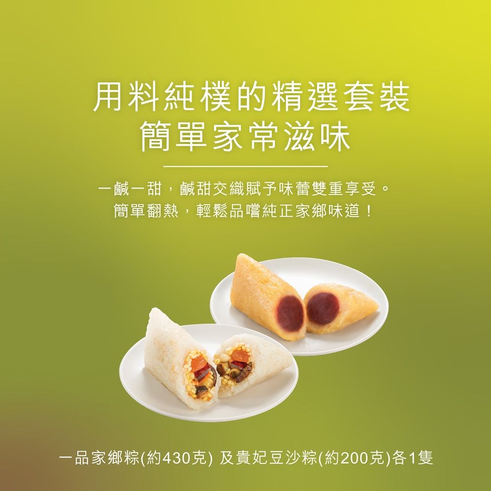 一鹹一甜,用料純樸的精選套裝;貴妃豆沙粽用上優質食材,豆沙綿密味濃配上香軟糯米及粽葉清香;一品家鄉粽的松化綠豆搭上原只鹹蛋黃,口感層次豐富扎實,簡單家常滋味。