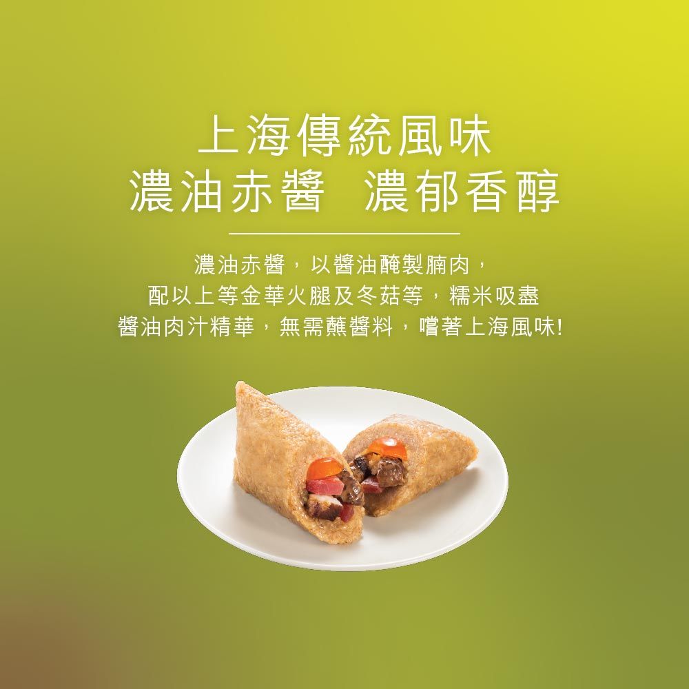 遵從上海傳統風味,濃油赤醬,先以醬油醃製腩肉,再用醬油肉汁浸泡糯米,配以金華火腿、冬菇、鹹蛋黃及瑤柱上湯,層次豐富,味道濃郁香醇。