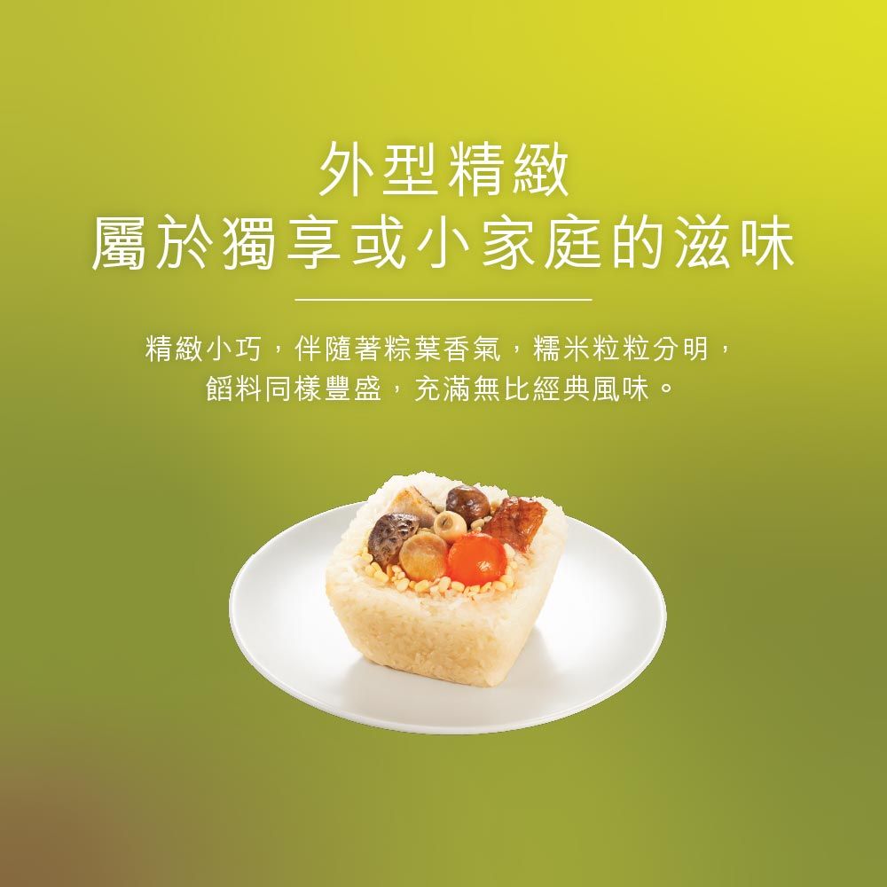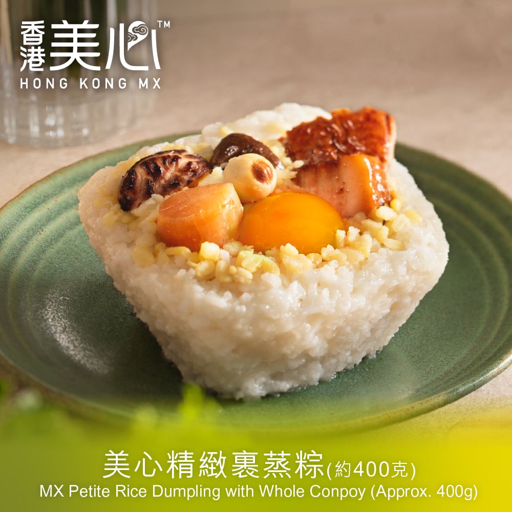 外型精緻的瑤柱裹蒸粽用料同樣豐足,粒粒軟糯糯米,鬆化綠豆,特選瑤柱及燒鴨,加上入口即溶的腩肉和甘香鹹蛋黃、厚肉花菇,蓮子及甘栗,是屬於獨享或小家庭的滋味!