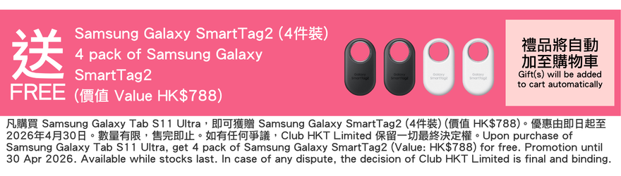 Galaxy Tab S11 Ultra Wi-Fi (包括嵌入式電池): 1ea 數據線 (C to C) : 1ea S Pen : 1ea SIM 插針: 1ea Quick Start Guide (English + Traditional Chinese) : 1ea