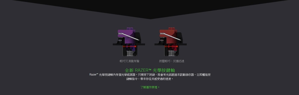 Razer™ 光學按鍵軸內有個光學感測器。只要按下按鍵,就會有光訊號進來啟動接收器,立即觸發按鍵軸指令,帶來你從未感受過的速度。