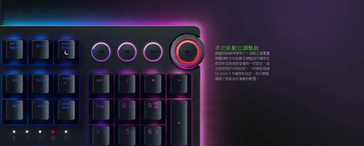 鍵盤控制變得更快了。搭配三個實體媒體鍵的多功能數位調整鈕可讓你立即存取從亮度到音量的一切設定,並在短短幾秒內就設好。一切都能透過 Synapse 3 來編程和自訂,你只要點個幾下就能設好喜歡的配置。