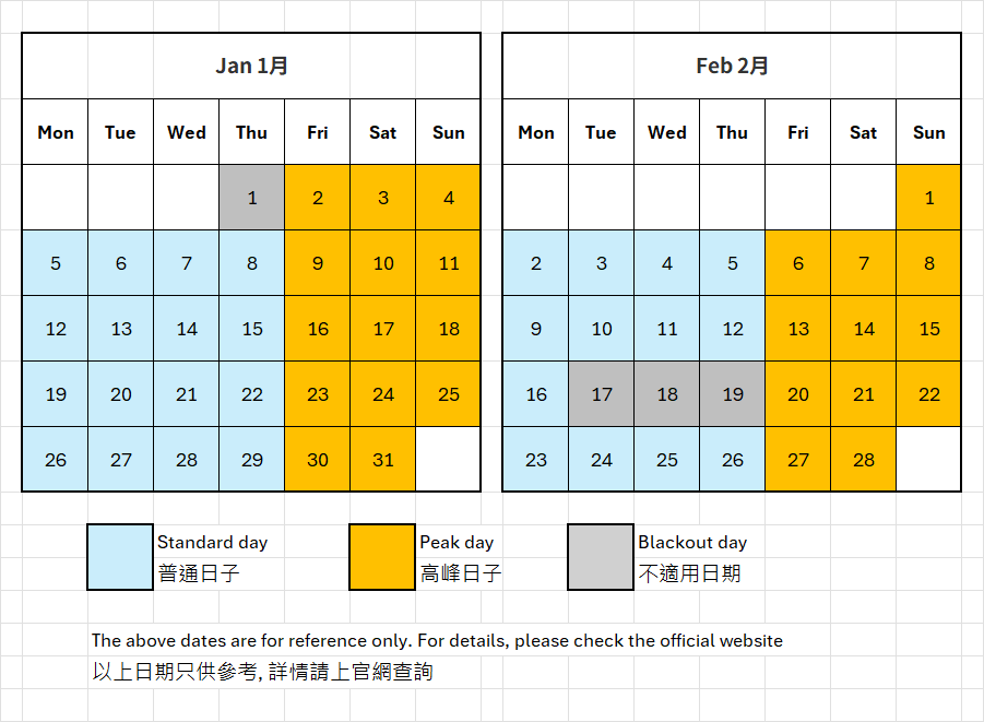 - 請在預定前確認選擇 (普通日子/ 高峰日子)