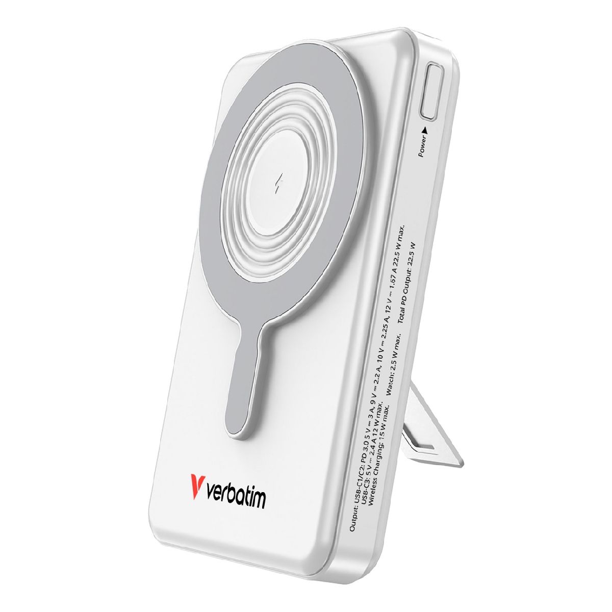 Verbatim Charge 'n' Go 5 合 1 磁性無線行動電源專為擁有多台裝置的使用者設計,提供全面的充電解決方案。這款行動電源配備無線充電板、2 條滿足常見充電需求的內建電纜以及雙向快速充電 USB-C 端口,可讓您同時為多達 4 台設備充電。無論是您的手機、耳機或智慧手錶,這款行動電源都能有效滿足您所有的充電需求。其時尚的設計不僅節省空間,而且無需攜帶多個充電器,簡化了您的充電過程,同時保持連接。