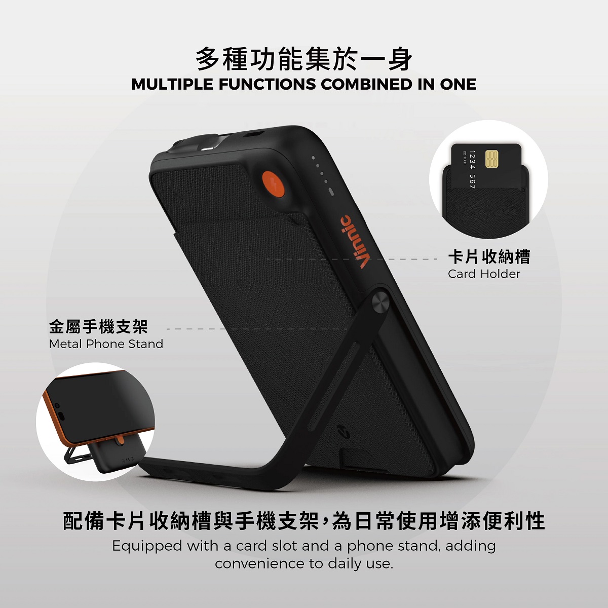 - 6合1多功能設計 — 整合磁吸無線充電、USB-C 有線快充、內置充電線、卡片收納及支架功能