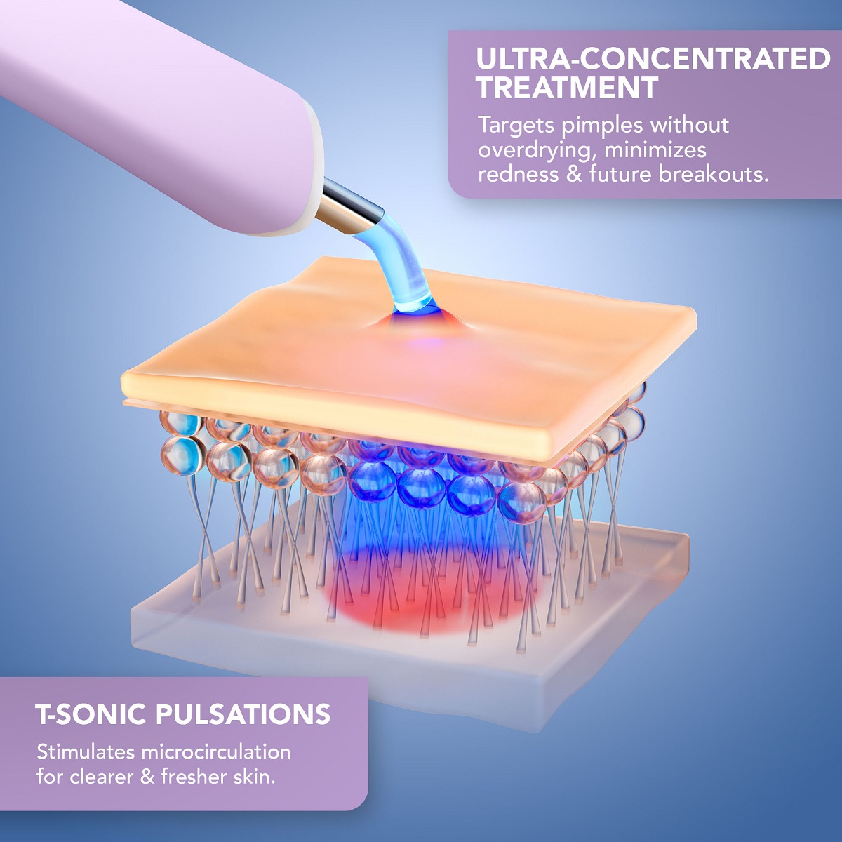 T-SONIC™ 透膚脈動由緩至強逐步提升,舒緩按摩肌膚,有助於藍光遞進式深層滲透改善肌膚,並促進抗痘護膚品的吸收。
