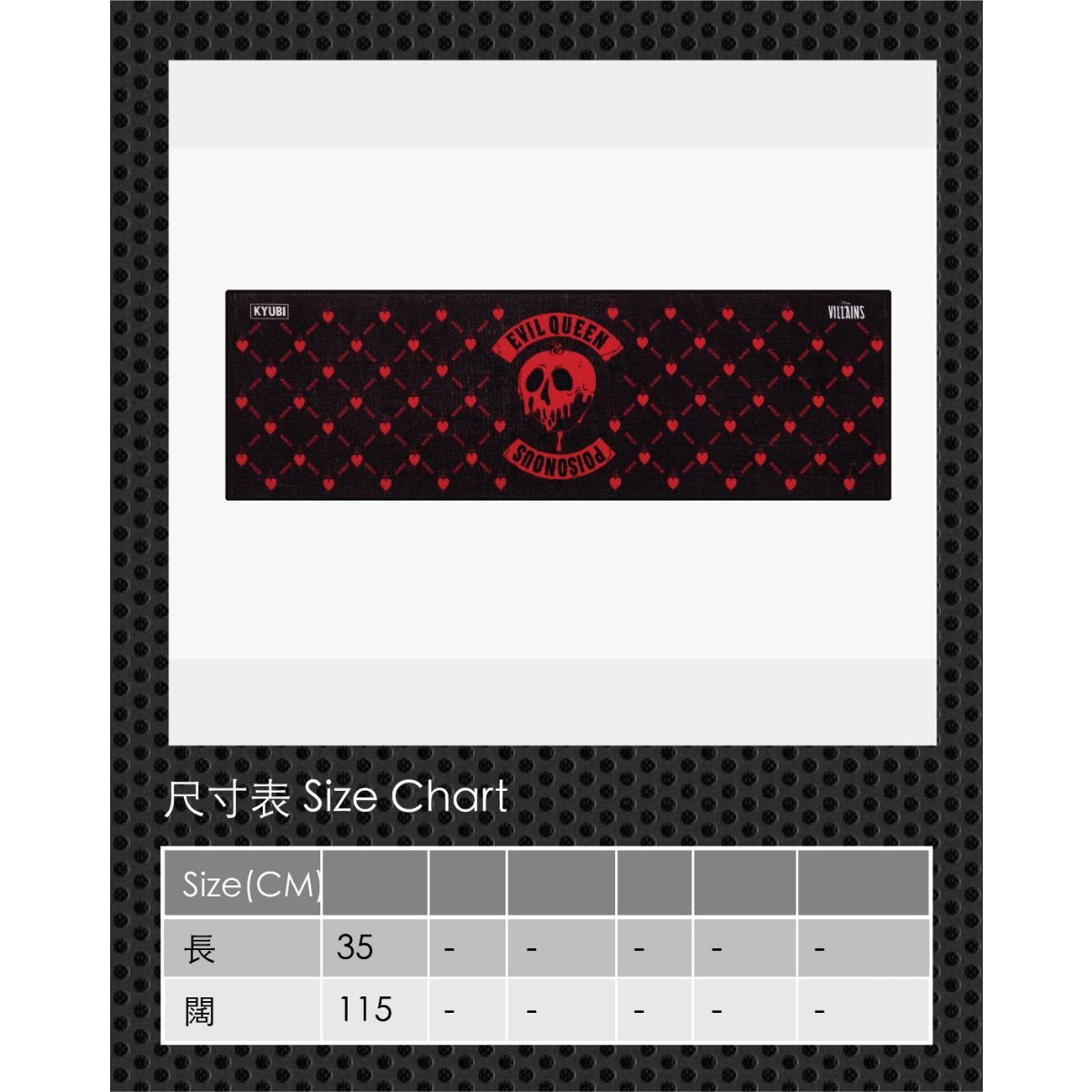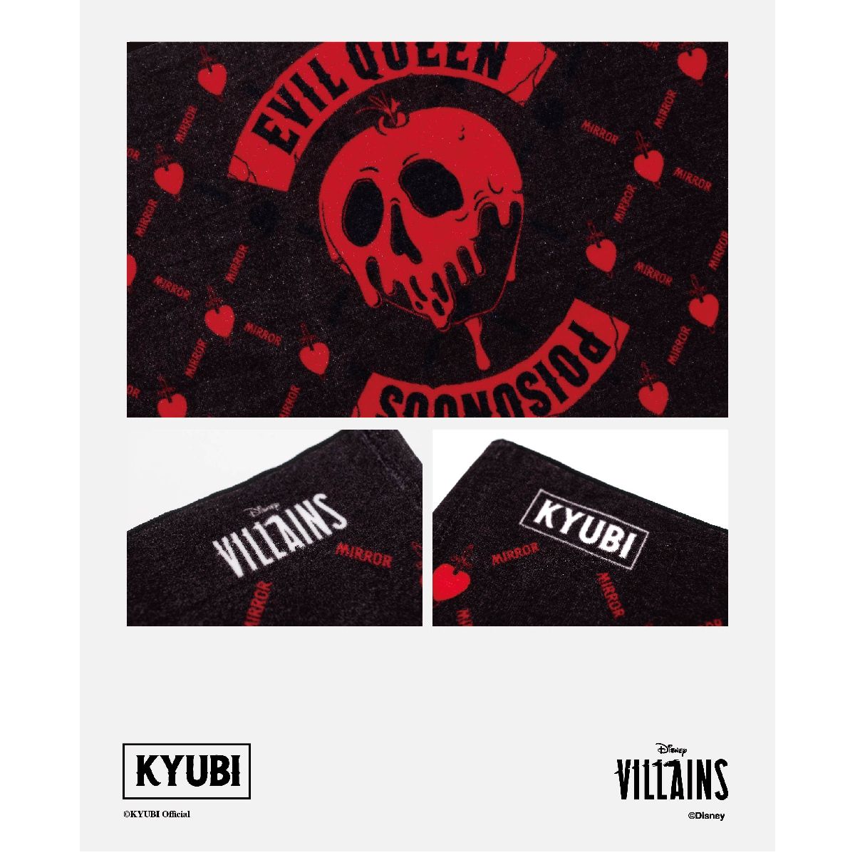 黑紅配色毛巾,以經典KYUBI CROSS設計,配搭重覆的心劍圖案,以及一顆致命的毒蘋果。