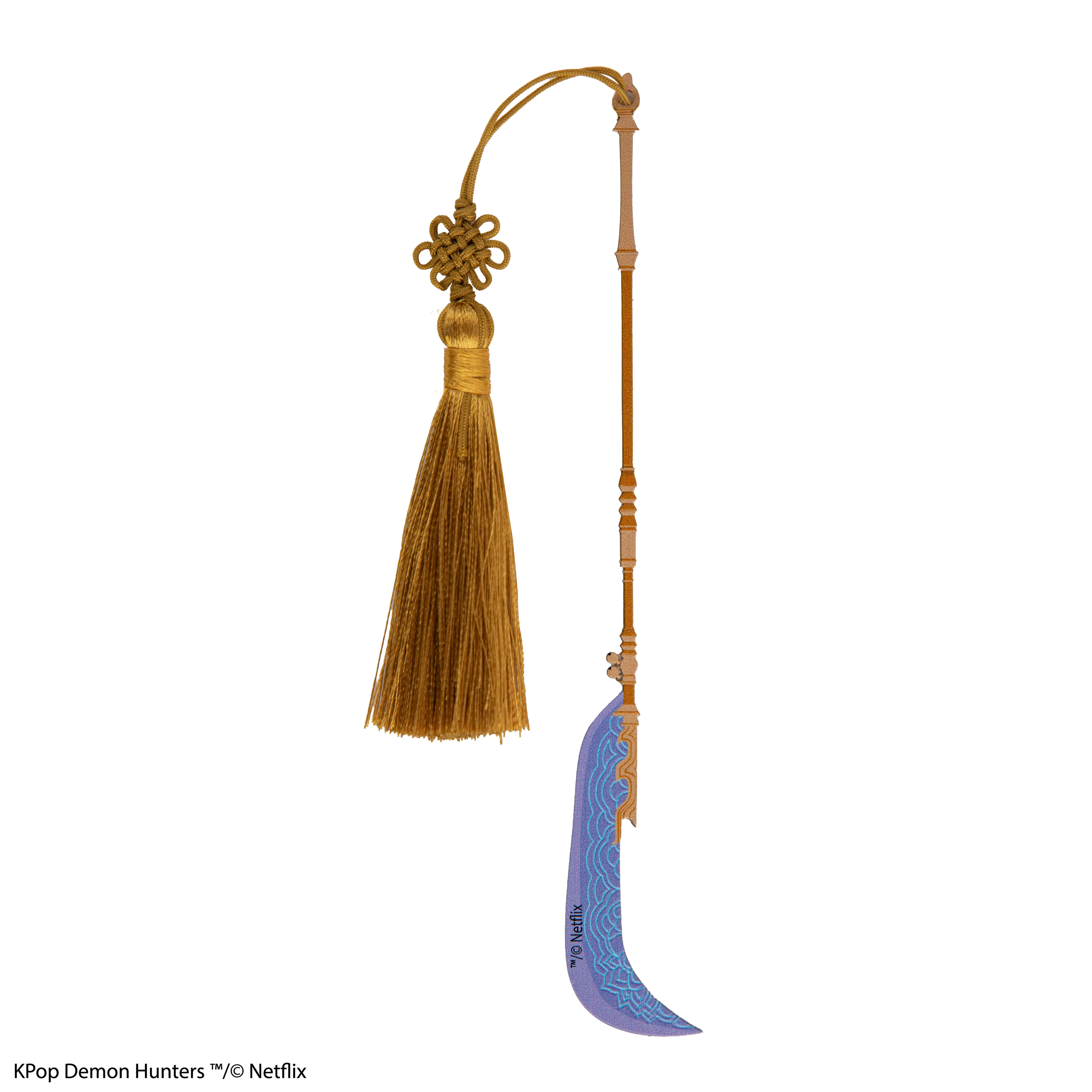 這款來自《KPop Demon Hunters》的 Mira 金屬書籤,靈感源自韓國傳統彎刀(Gok-do),展現大膽與優雅並存的氣場。弧形刀刃設計配上細緻紋理與紫色細節,完美呼應 Mira 火熱又自信的風格。夾在書頁之間,為你的閱讀時光增添銳利獵人能量。