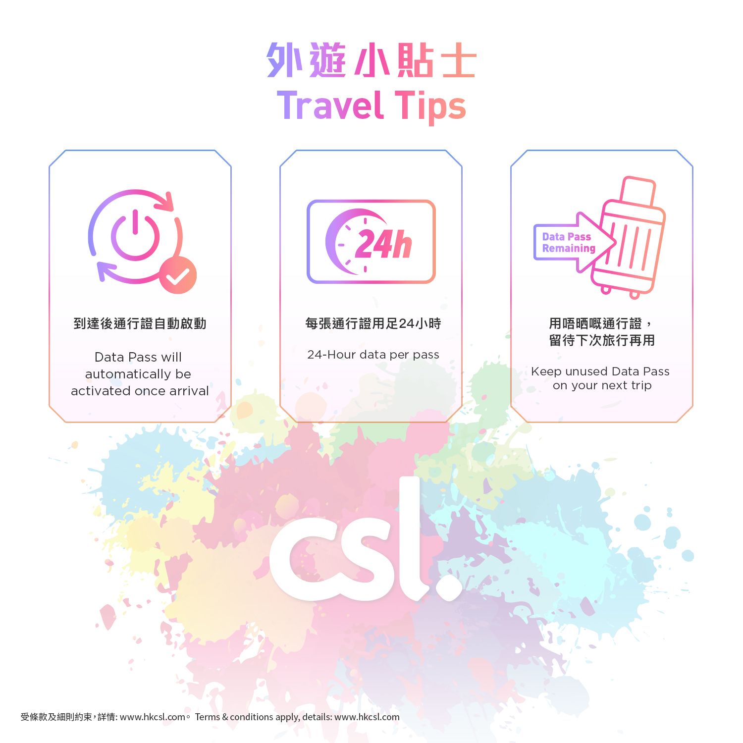 *受條款及細則約束,產品詳細資料,請瀏覽: https://www.hkcsl.com/tc/csl-roaming-prepaid-sim/