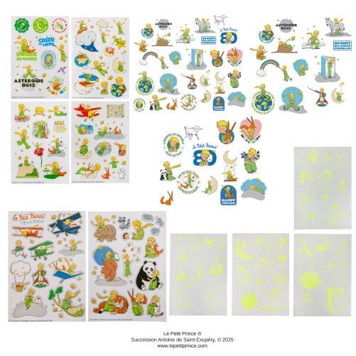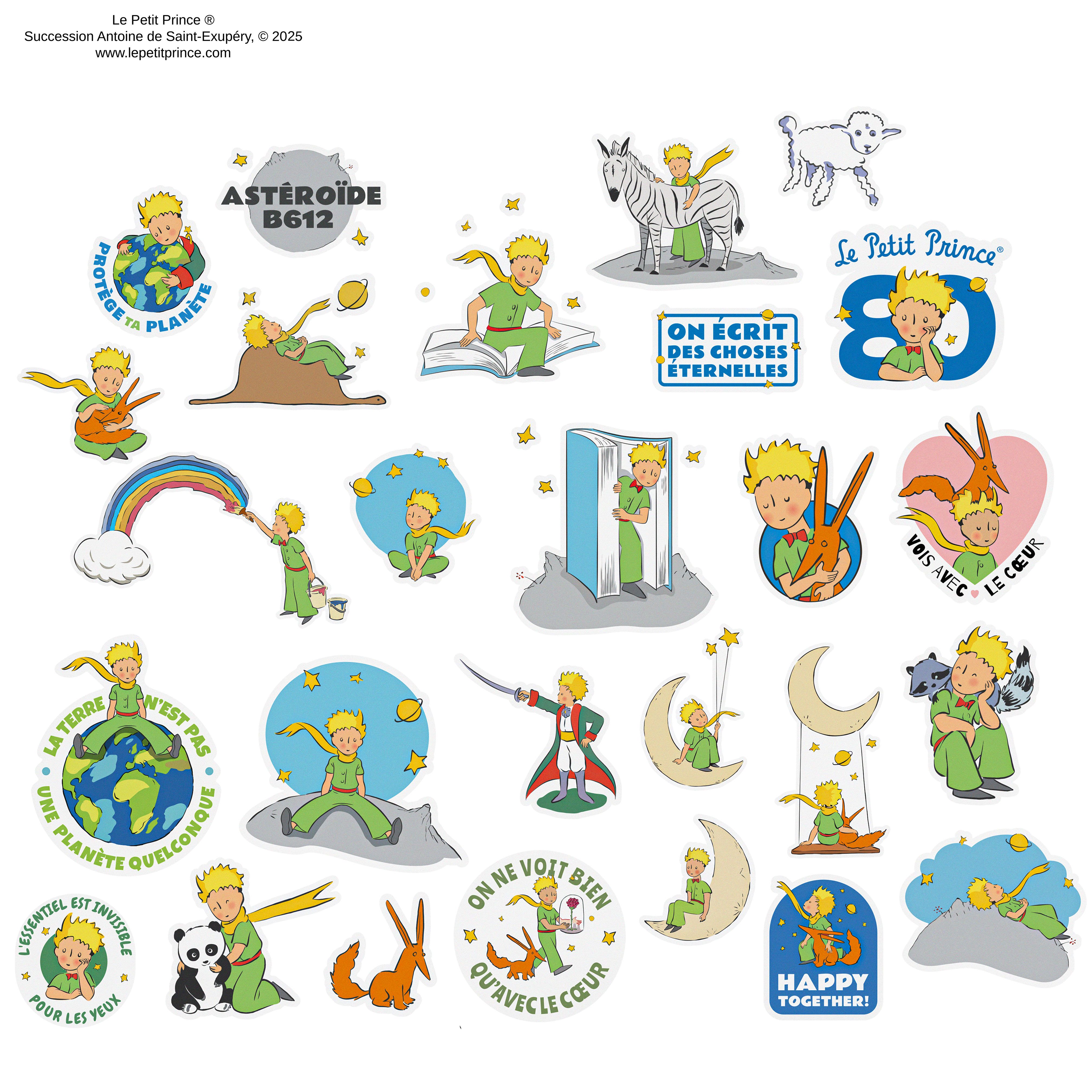 其中展現了深受喜愛的小王子多個經典場景:站在自己的小行星上、從書中走出、細心照料他的羊盒,或是與動物們共享時光——每一枚貼紙都捕捉了聖艾舒比尼筆下那份永恆的奇蹟與感動。