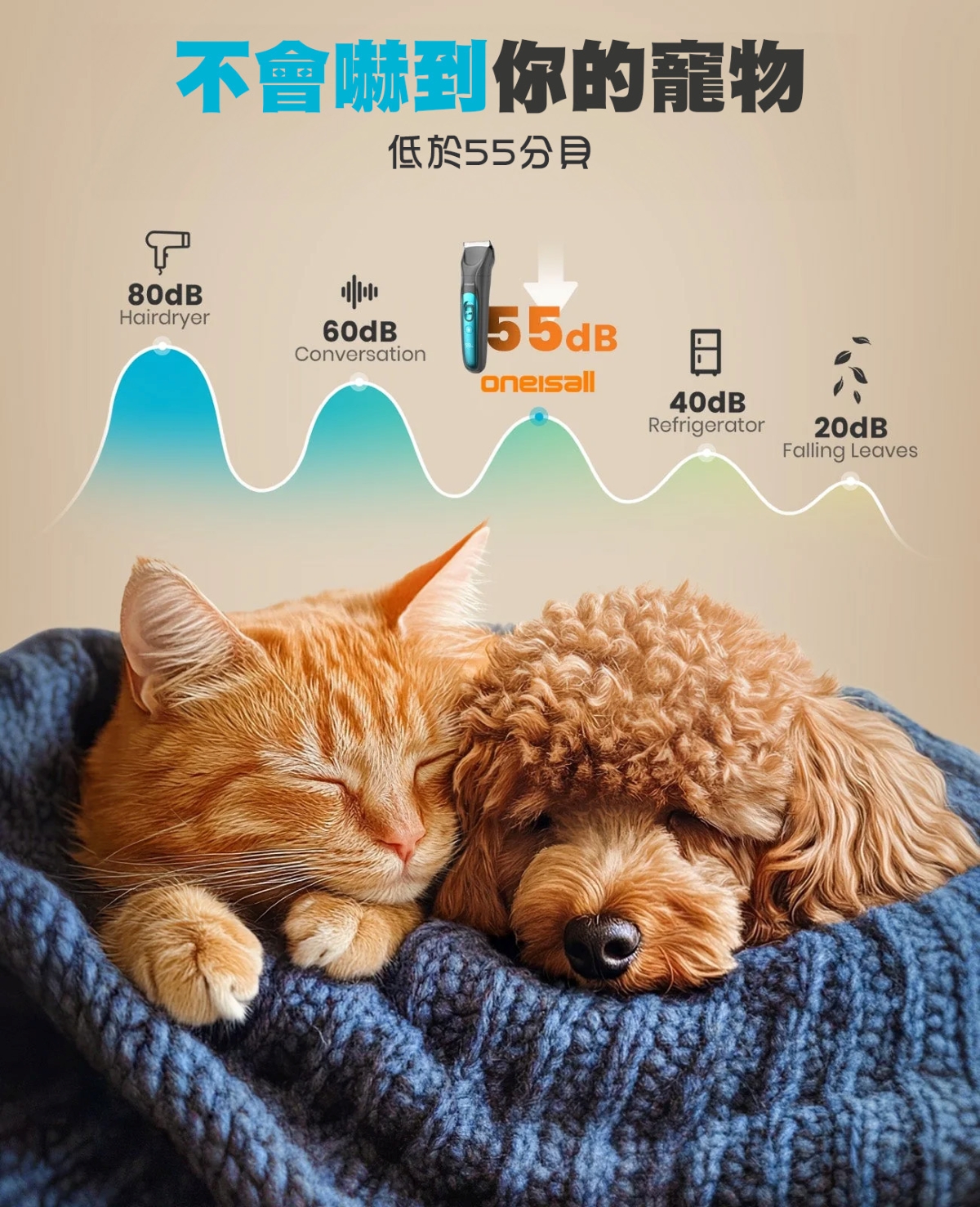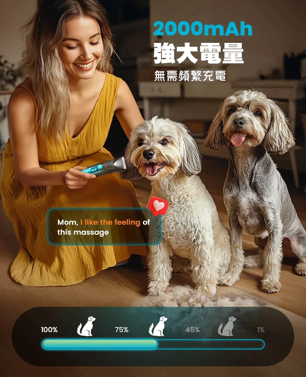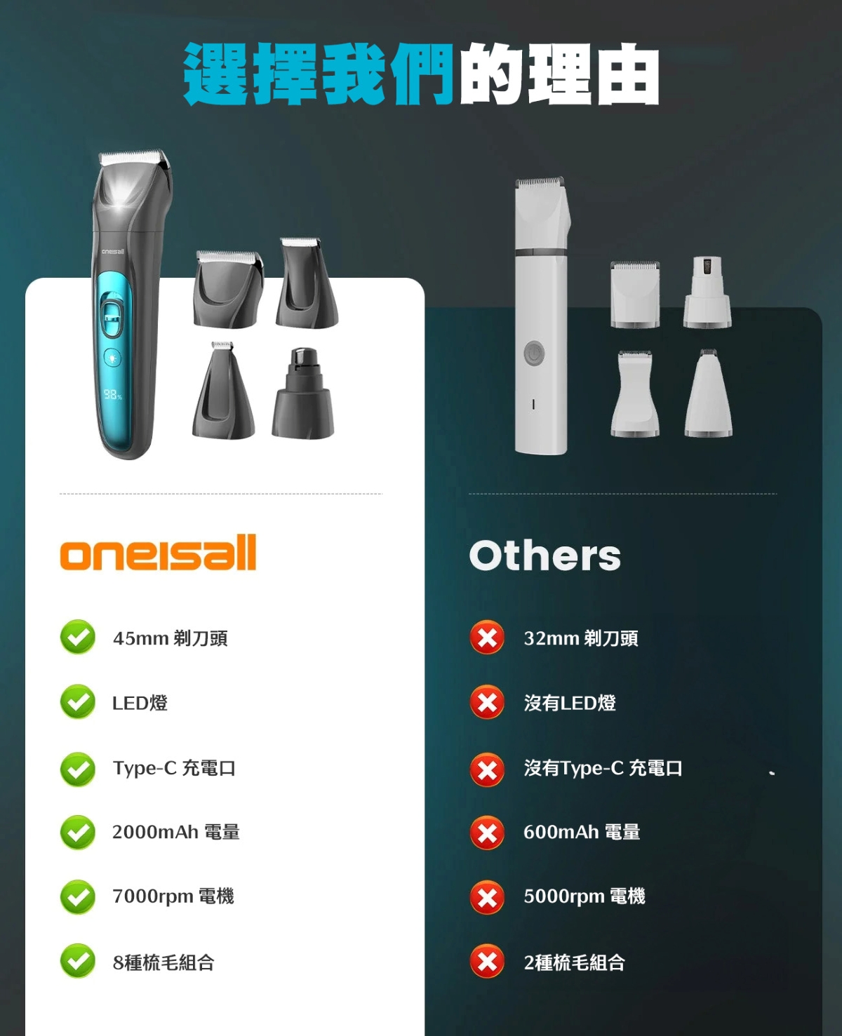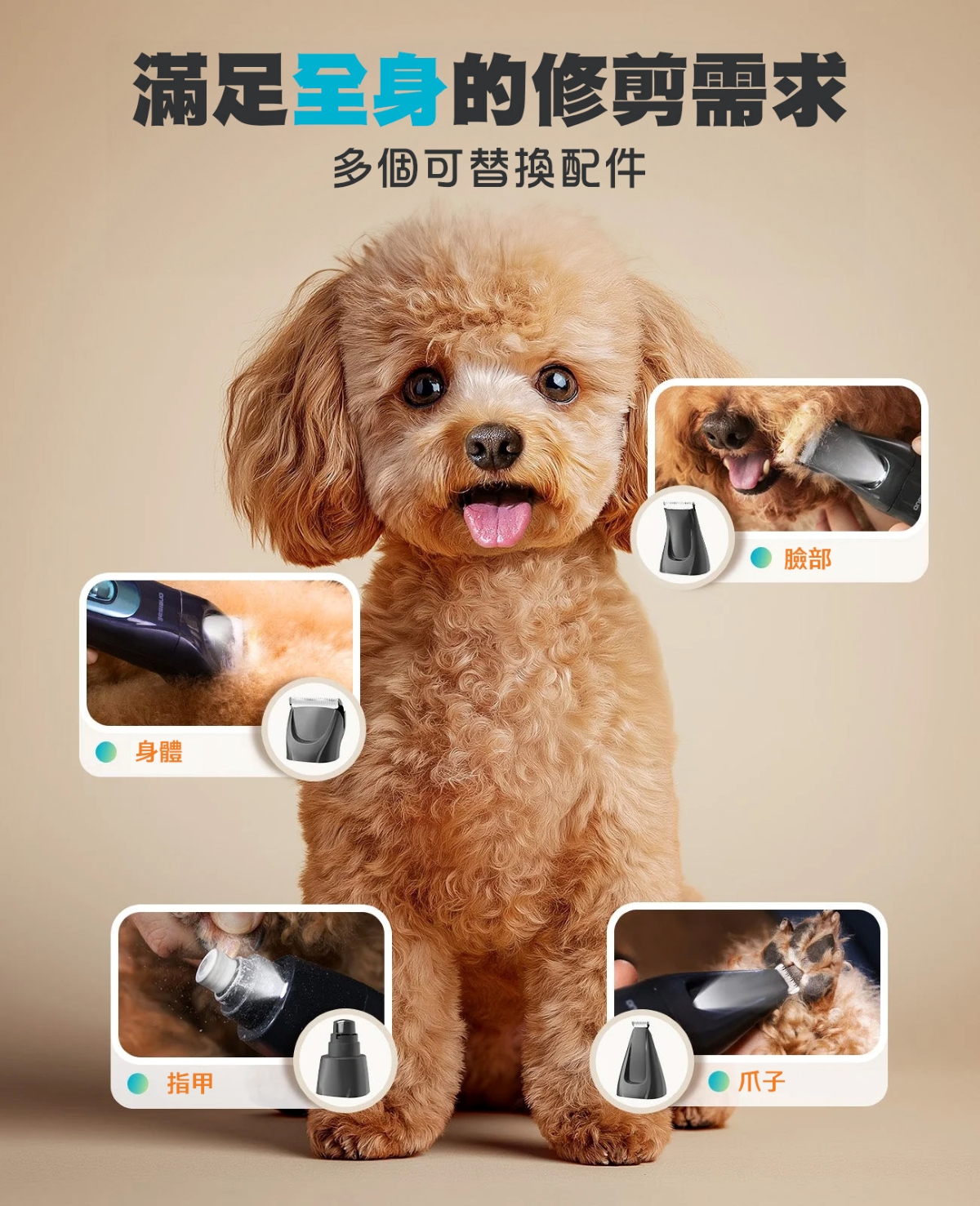 4款可替換修剪配件,8個定位梳,照顧寵物各部位修剪需要