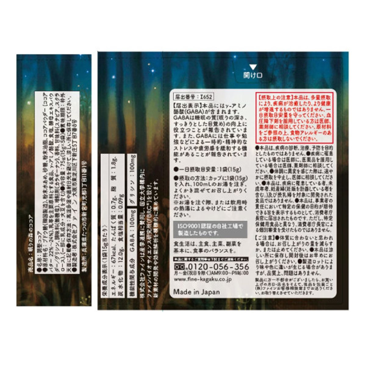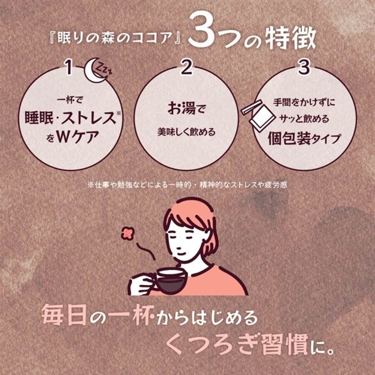 「森谷睡夢可可粉」主要含有GABA (γ-氨基丁酸)(100mg),讓亢奮的腦細胞休息,改善睡眠品質,促進深層睡眠,亦具有緩解工作或學習所造成的精神壓力和疲勞感,為忙碌的日常生活帶來神清氣爽的早上。