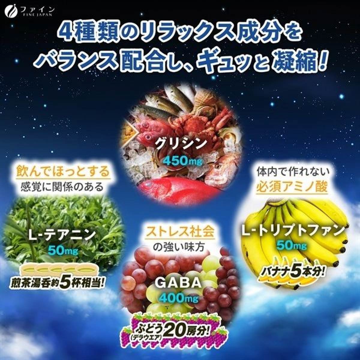 甘氨酸、L-茶氨酸 及GABA,有效對腦部有過度興奮安定作用,促進放鬆和消除神經緊張,阻止與相關的信息抵達腦指示中樞,可從根本上鎮靜神經,可降壓幫助及改善失眠,睡眠障礙,促進深層睡眠,令人容易入睡,針對多夜夢人士。