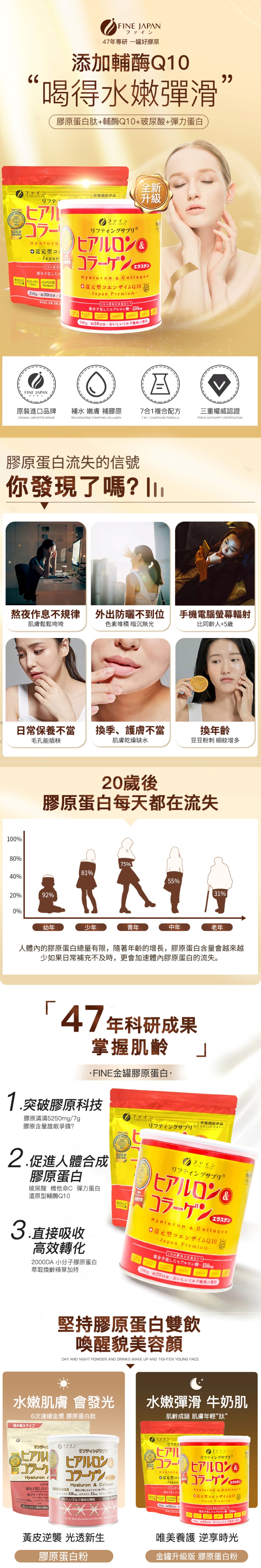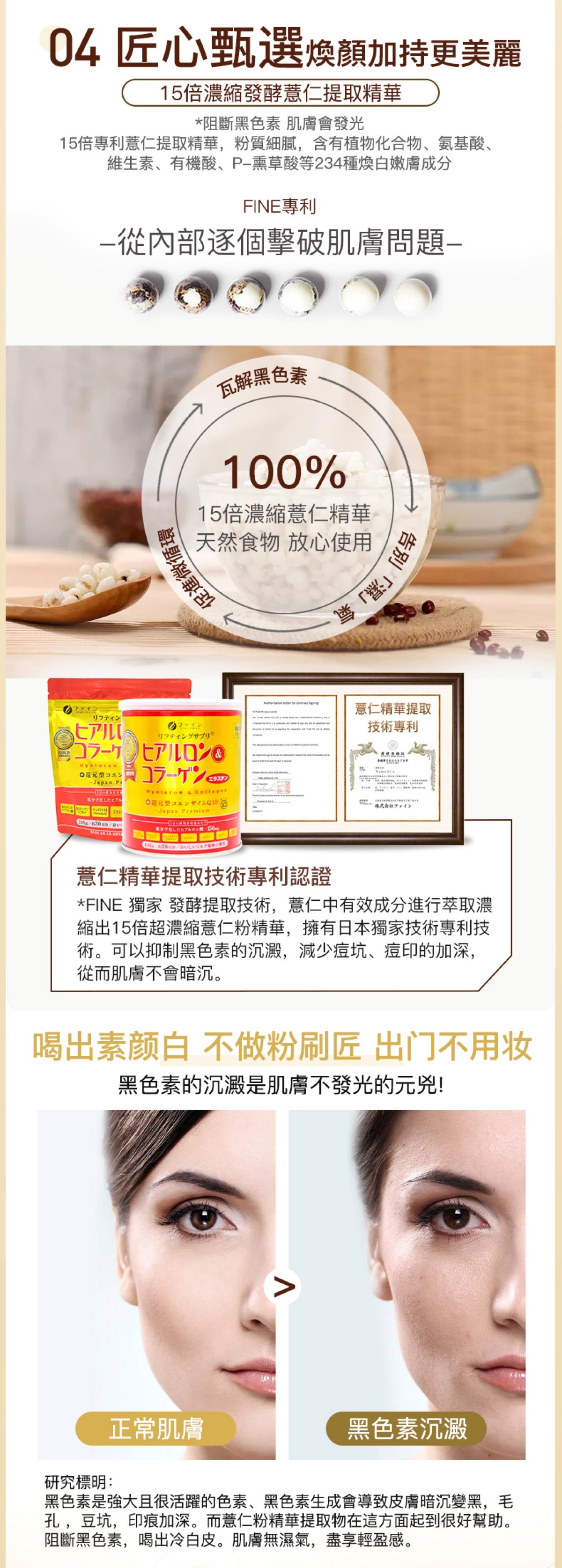 成份蘊含豐富由深海魚直接提煉,透明質酸及膠原蛋白補充肌膚所需養分,幫助肌膚回復彈性,保濕肌膚及回復青春本色。配合了支持美麗皮膚的薏仁提取物、維生素C、生物素等,讓失去立體感的皮膚重新恢複立體感,肌膚恢複青春活力,日常生活中補充美容成分從而找回青春和美麗,每7g中含有保持高度水潤和保濕能力。