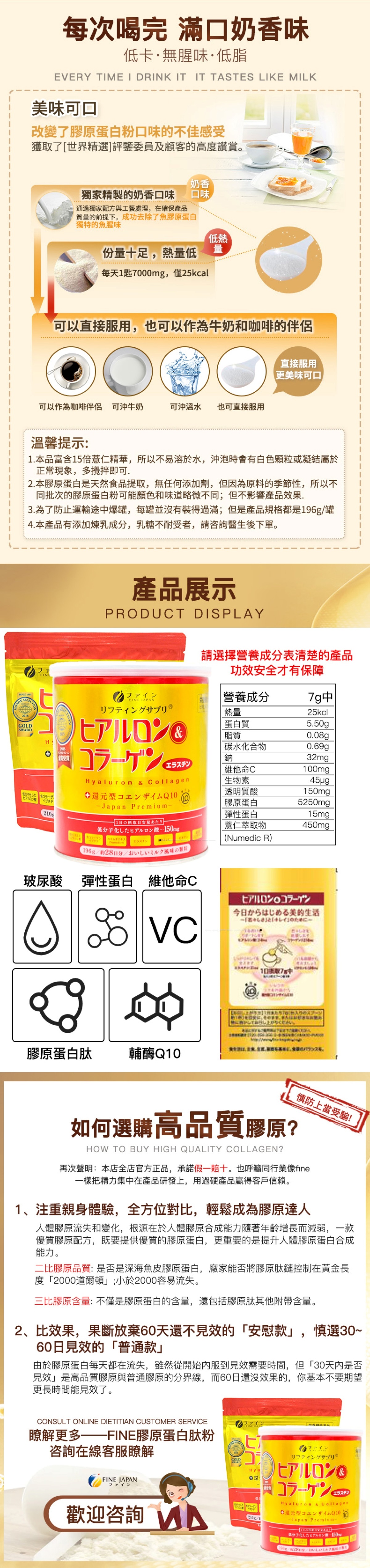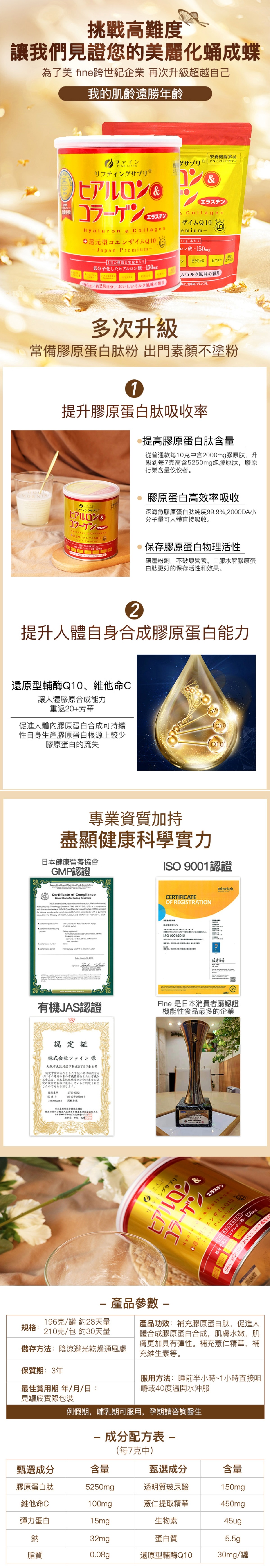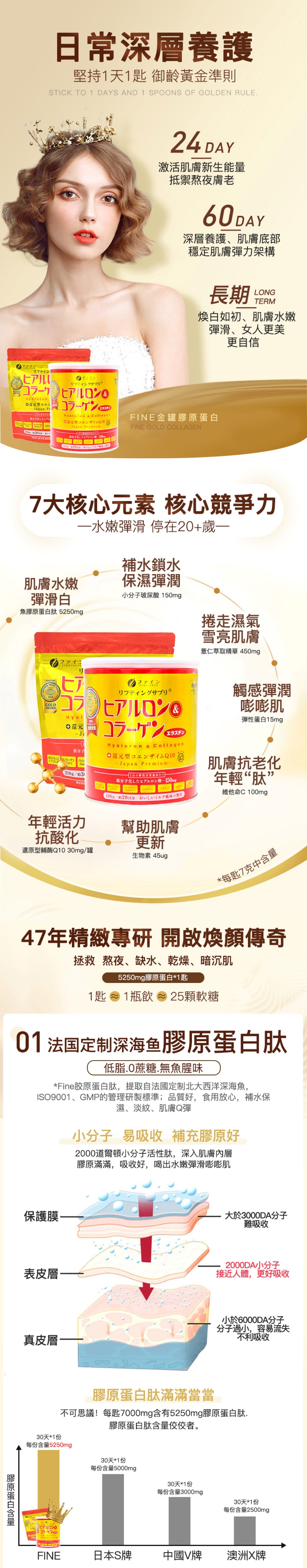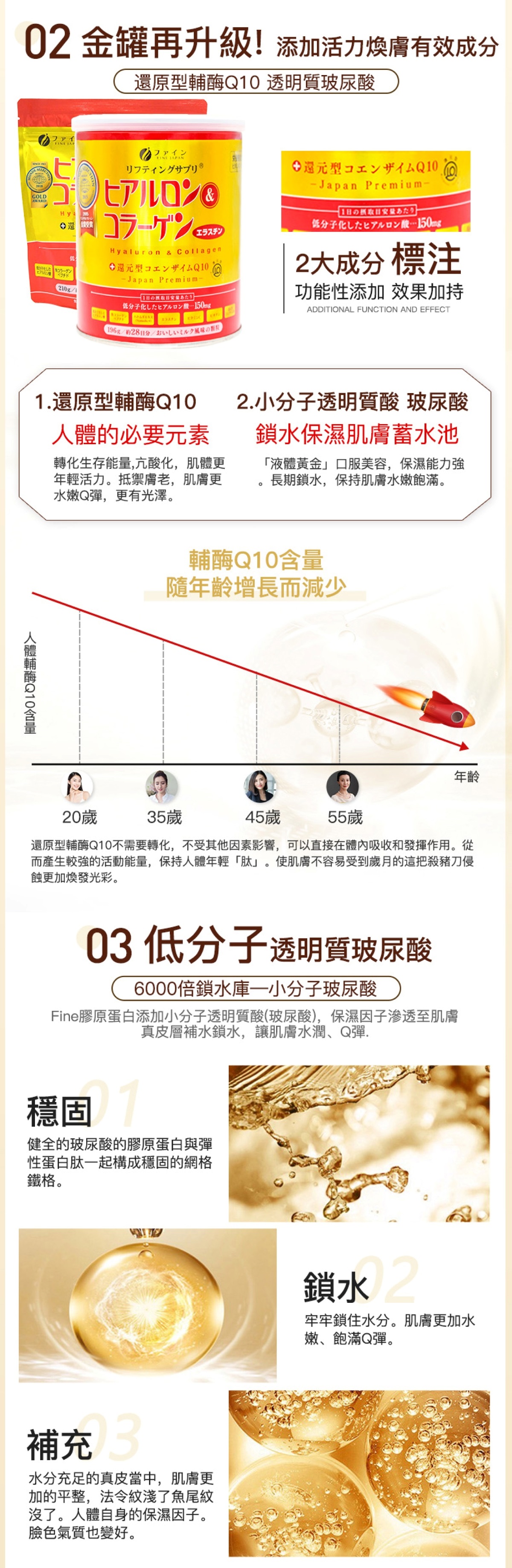 由日本自家廠嚴格研製,優之源®金裝透明質酸 + 膠原蛋白及還元輔酶Q10,其份子極細,使人體迅速吸收,促進皮膚細胞自行更生,保持皮膚柔嫩,促進營養吸收的更理想效果,輕鬆滋養,寵愛妳的肌膚。