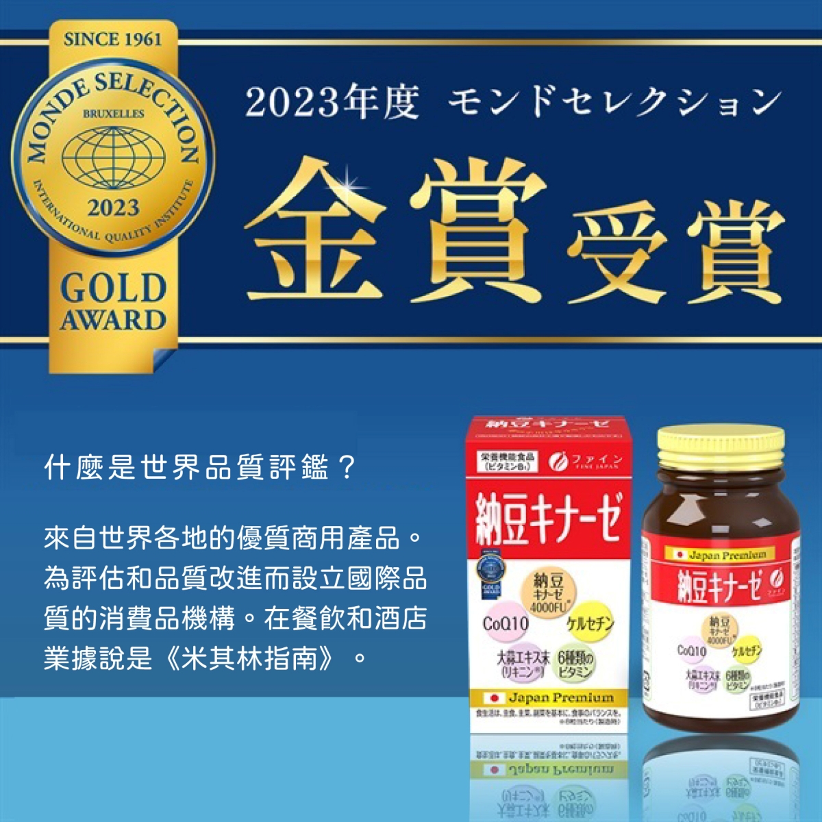 優之源®納豆激酶+Q10片,在「世界精選」比利時 Monde Selection 獲得2023年金獎榮譽,優質產品備受國際肯定。