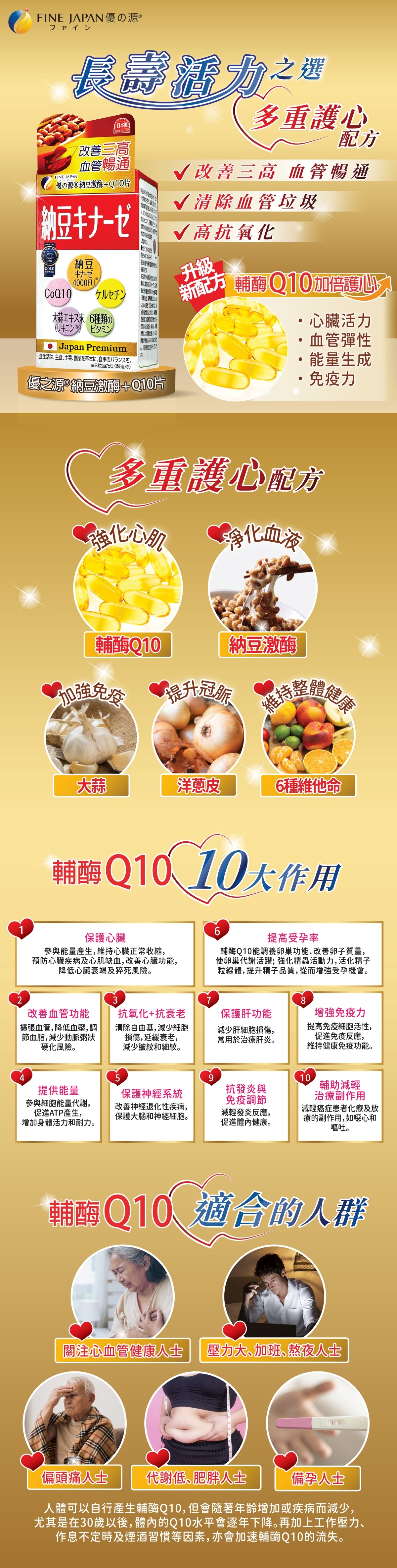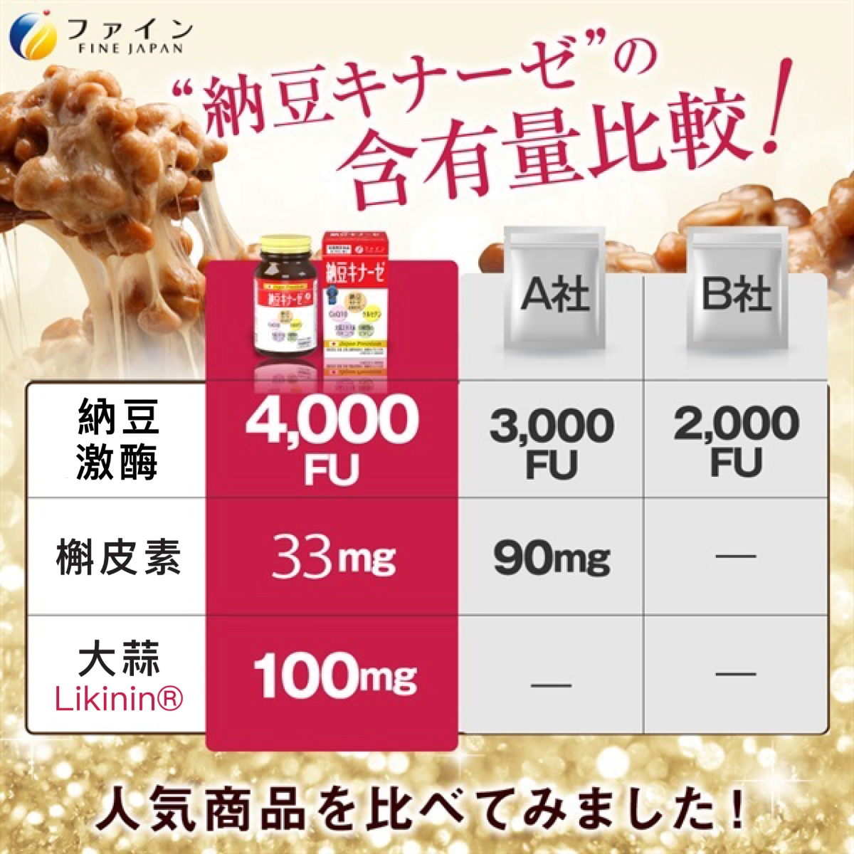納豆(發酵後的黃豆)中的黏稠物質,含有一種稱為「納豆激酶」的酵素,有效淨化血液,配合可強化血管彈性的輔酶Q10、的洋蔥皮萃取物、大蒜萃取物及6種維生素,作為日常重要的保健營養補充品。