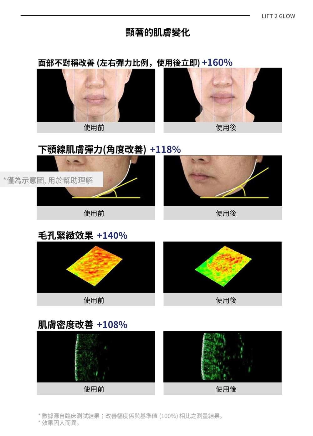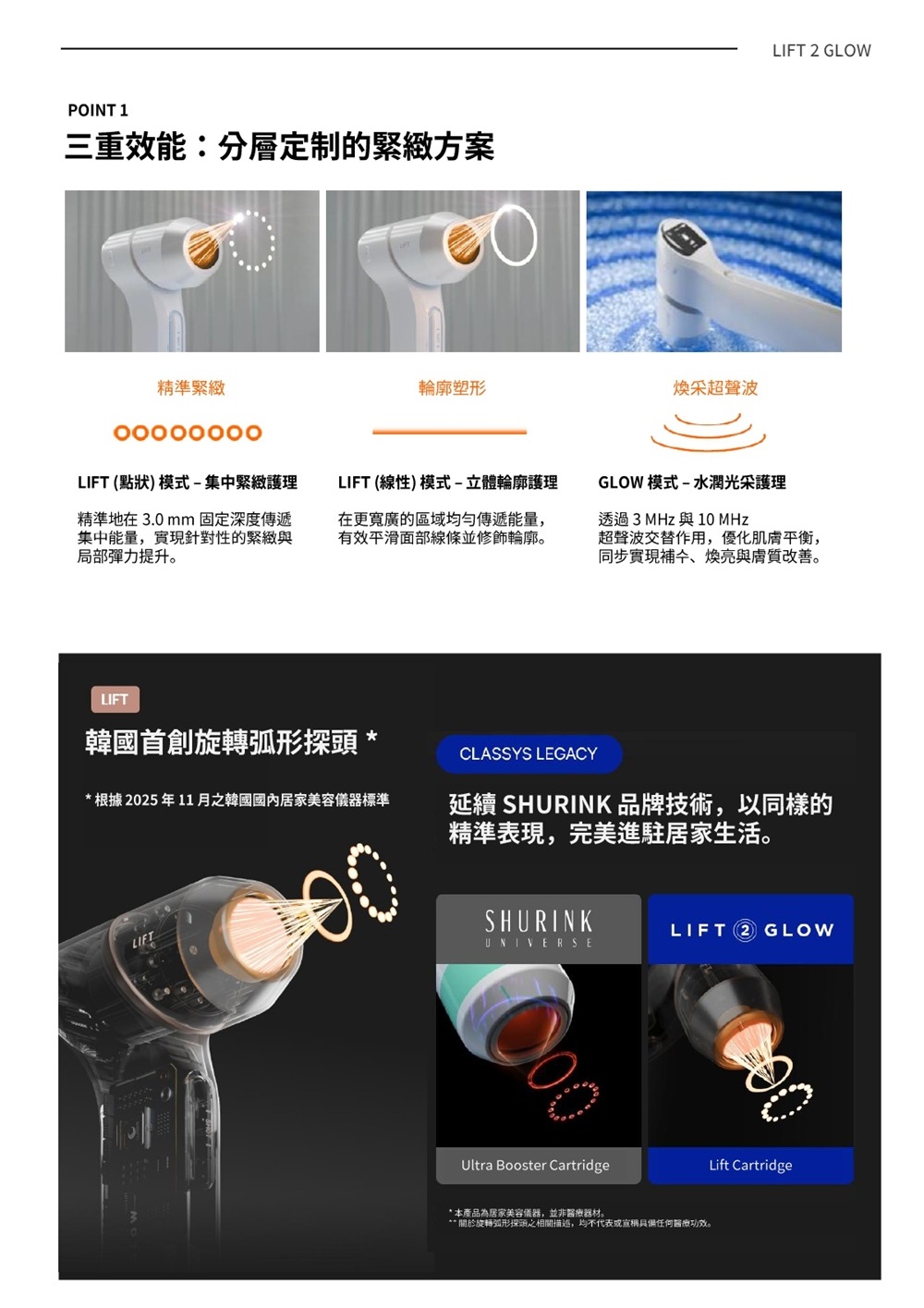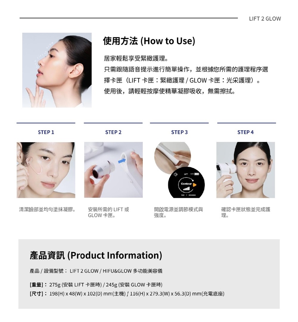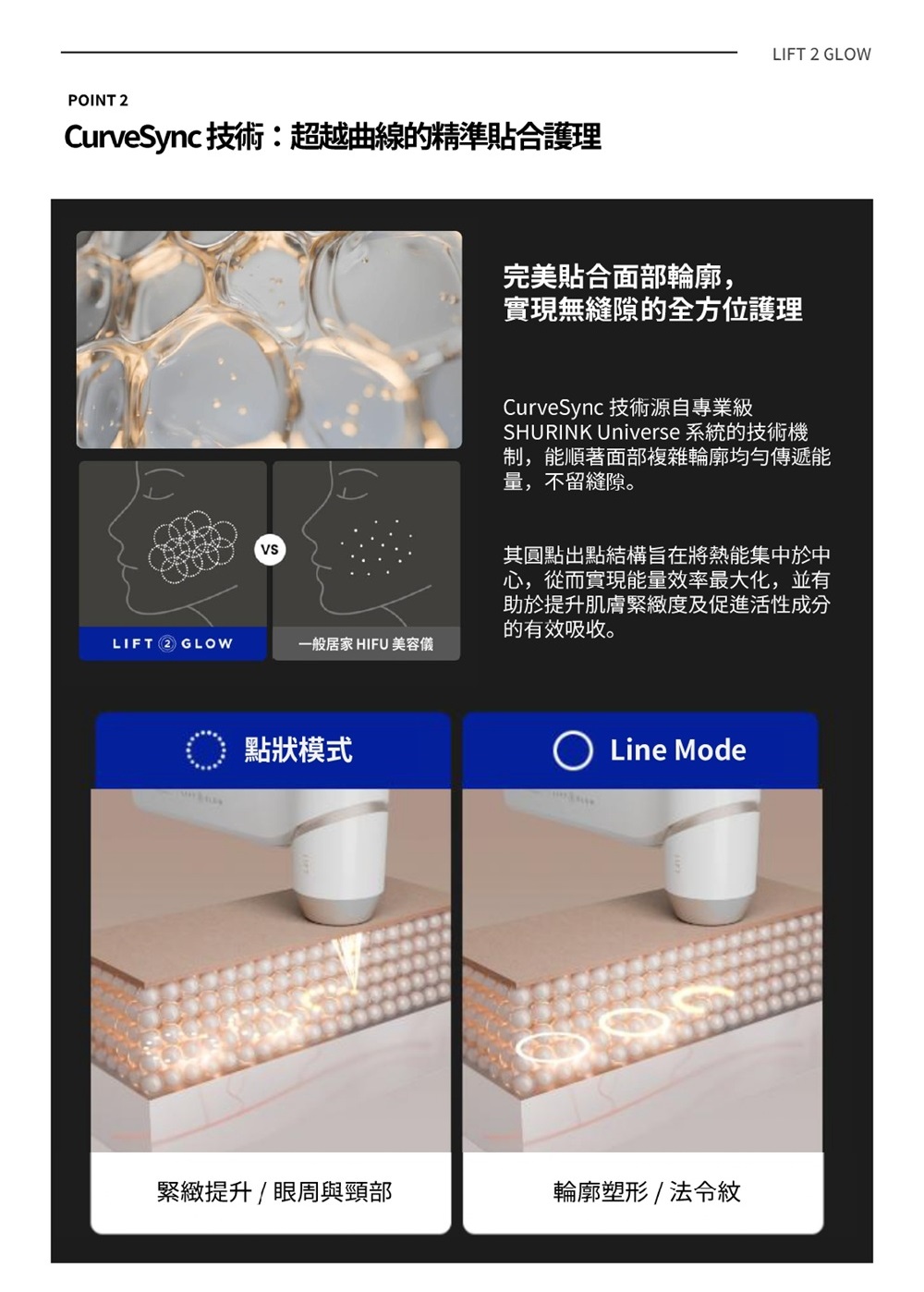• 三大模式:點狀提拉 (Dot)、線性輪廓 (Line)、亮膚保濕 (Glow)