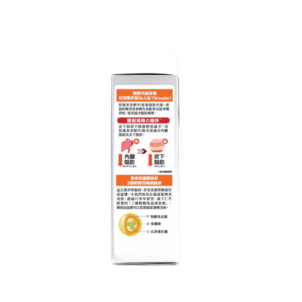 - 森下仁丹「百年藥廠」與京都大學的研究成果 — 日本森下仁丹 Bifina® Slim 晶球益生菌瘦身排毒配方 — 以比菲德氏菌為主,配合專利玫瑰果多酚MJ,特別針對提升激活新陳代謝,瘦身減脂。
