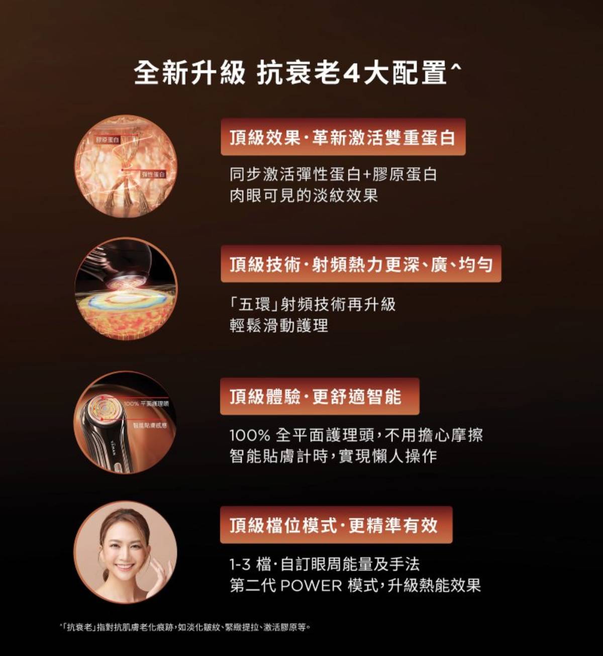 全新第五代射頻升級,五環設計熱場更廣、滲透更深,有效激活膠原+彈性蛋白再生,全面提拉輪廓,改善鬆弛與深紋。