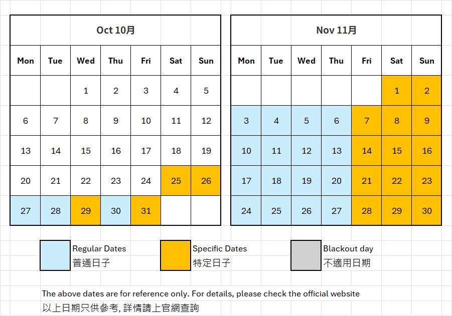 - 三歲以下兒童免費不適用日期:公眾假期不適用