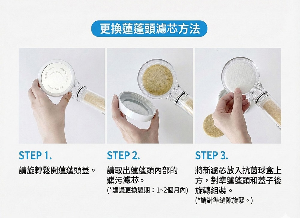 1個蓮蓬頭 (含主體沉澱過濾器+頭部沉澱抗菌陶瓷球過濾器,已預先安裝)