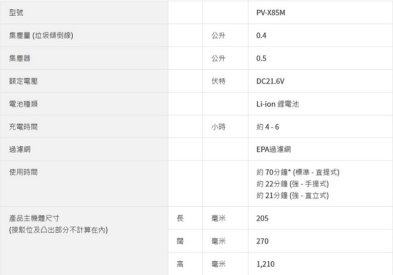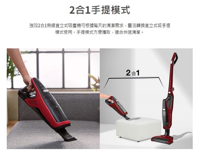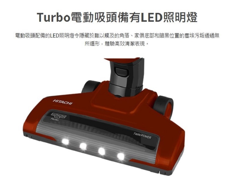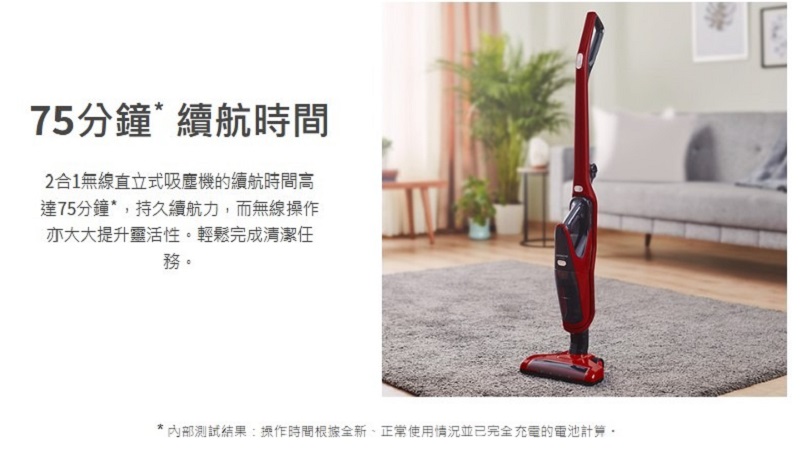 約 21分鐘 (強 - 直立式) - 配件︰TURBO電動吸頭 (備LED照明燈),2合1縫隙吸頭 (吸塵刷・吸塵管)
