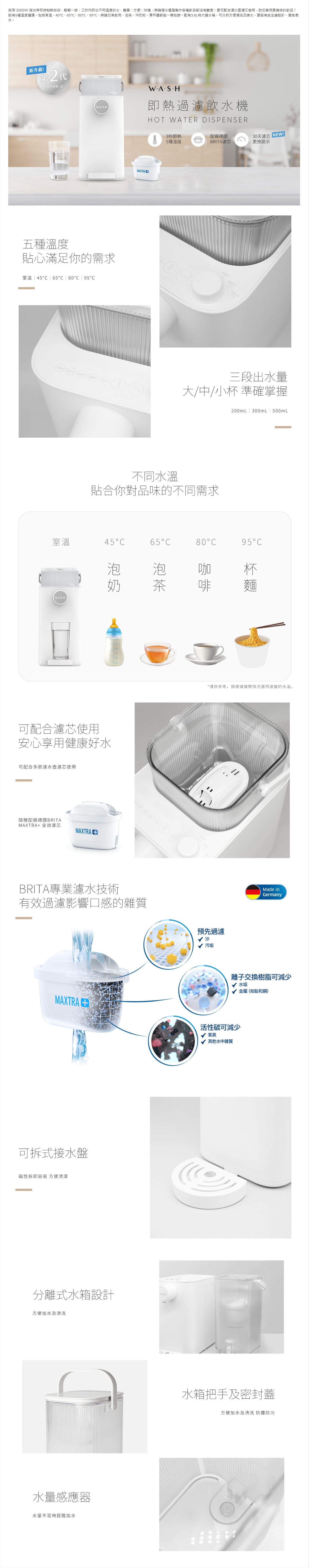 採用 2000W 高功率即時制熱技術,輕輕一按,三秒內即出不同溫度的水,簡單、方便、快捷,無論喝水還是製作各種飲品都沒有難度。更可配合濾水壺濾芯使用,加上30天濾芯更換提示,助您享用更美味的飲品!設有5種溫度選擇,包括常溫、45°C、65°C、80°C、95°C,無論日常飲用,泡茶,沖奶粉,煮杯麵都能一機包辦。配有3.6L特大儲水箱,可分拆方便清洗及換水,更設有安全鎖設計,避免意外。