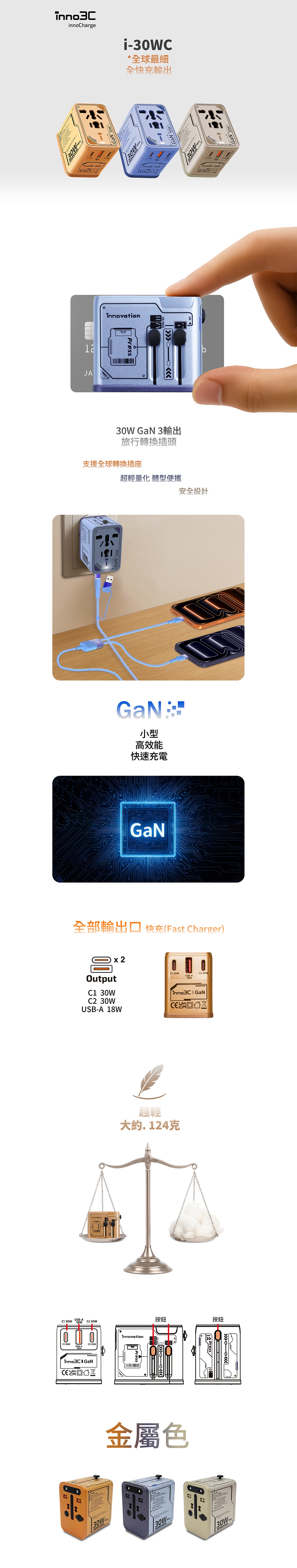 * 註: 截至1 Jan 2025, i-30WC 是全球最細最輕30W GaN 3輸出旅行轉換插頭(所有充電口均可快速充電)。