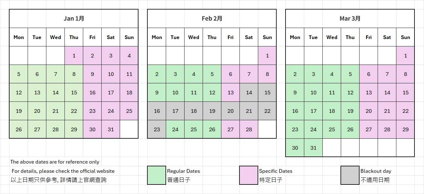 - 三歲以下兒童免費不適用日期:公眾假期不適用