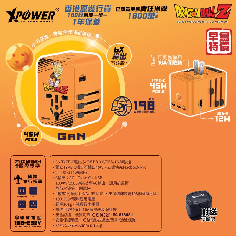 XPower x 龍珠Z TA45B 45W 6輸出 PD3.0/PPS快充旅行充電器 (悟空)