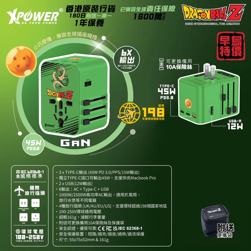 XPower x 龍珠Z TA45B 45W 6輸出 PD3.0/PPS快充旅行充電器 (神龍)
