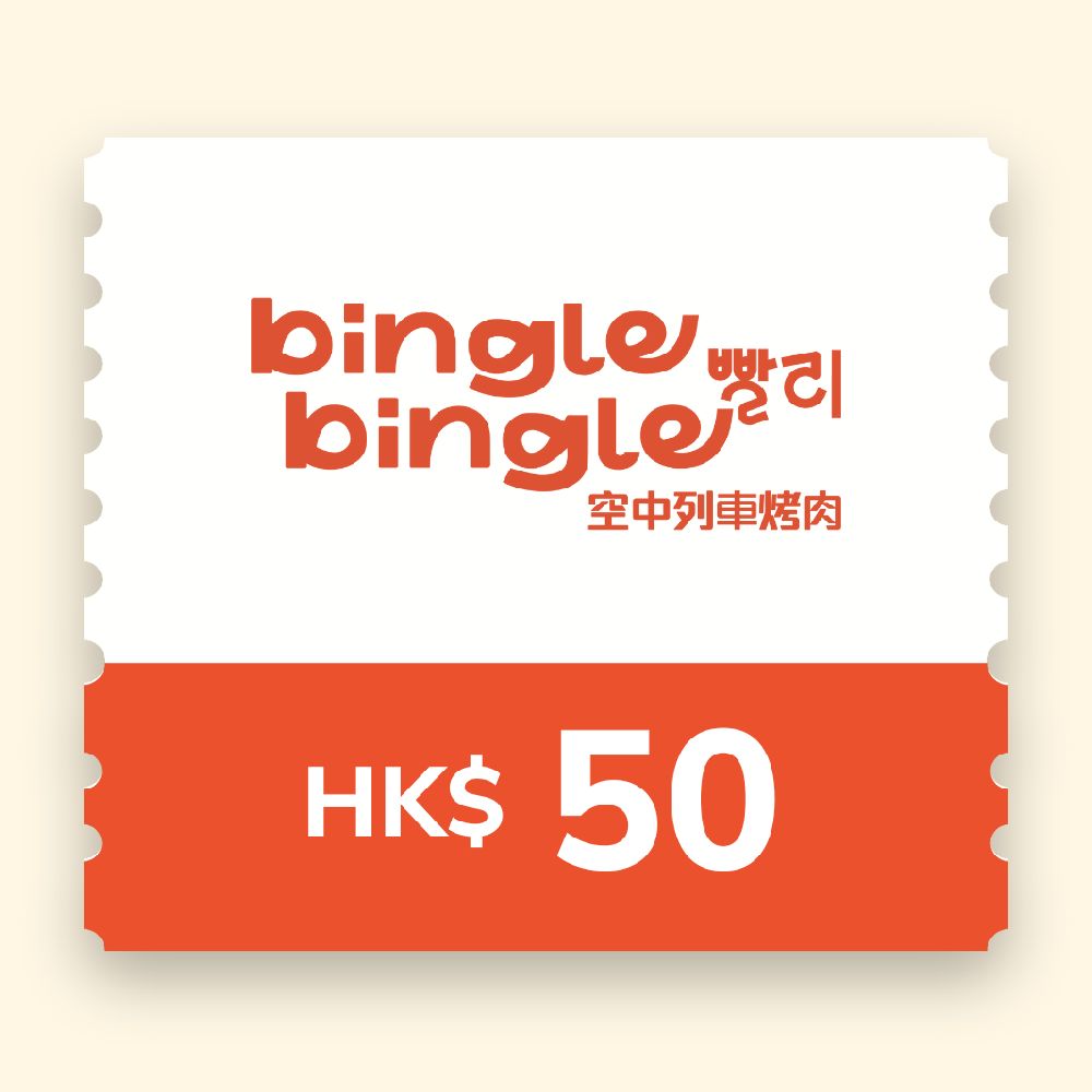 憑劵到Bingle Bingle香港分店惠顧正價食品、堂食及外賣均可作現金HK$50使用