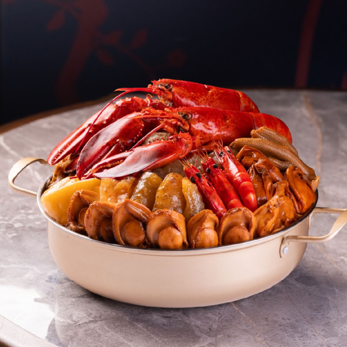 來自揚州的主廚將淮揚菜味道精髓匯聚於粵式傳統盆菜,嚴選珍貴食材如六頭鮑魚、花膠、海參、大蝦等,加入淮揚風味的鹹雞、醬鴨、小元蹄、百頁結、上海年糕,以及節慶食品髮菜、蠔豉、珍味福袋等廿款食材,配以大廚悉心烹調香稠濃郁的秘製鮑魚汁,矜貴矚目份量十足。