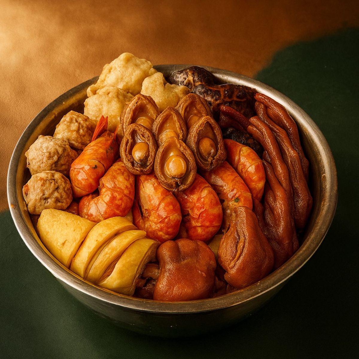 譽滿飲食界的中菜名廚邵德龍師傅精研秘方,嚴選時令珍饈,以傳統技藝炮製矜貴盆菜。食材包括︰蠔皇六頭南非鮑魚(6隻)、南乳新鮮豬手(6件)、潮式咸新鮮雞(半隻)、臘味鯪魚球(6粒)、豉油皇海蝦(6隻)、生扣鵝掌(6隻)、鮑汁冬菇(12隻)、蝦乾蘿蔔(12件)、福袋豆腐 (6件)、髮菜蓮藕(12件)、秘製盆菜汁