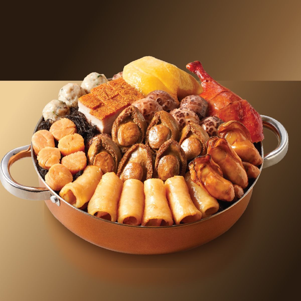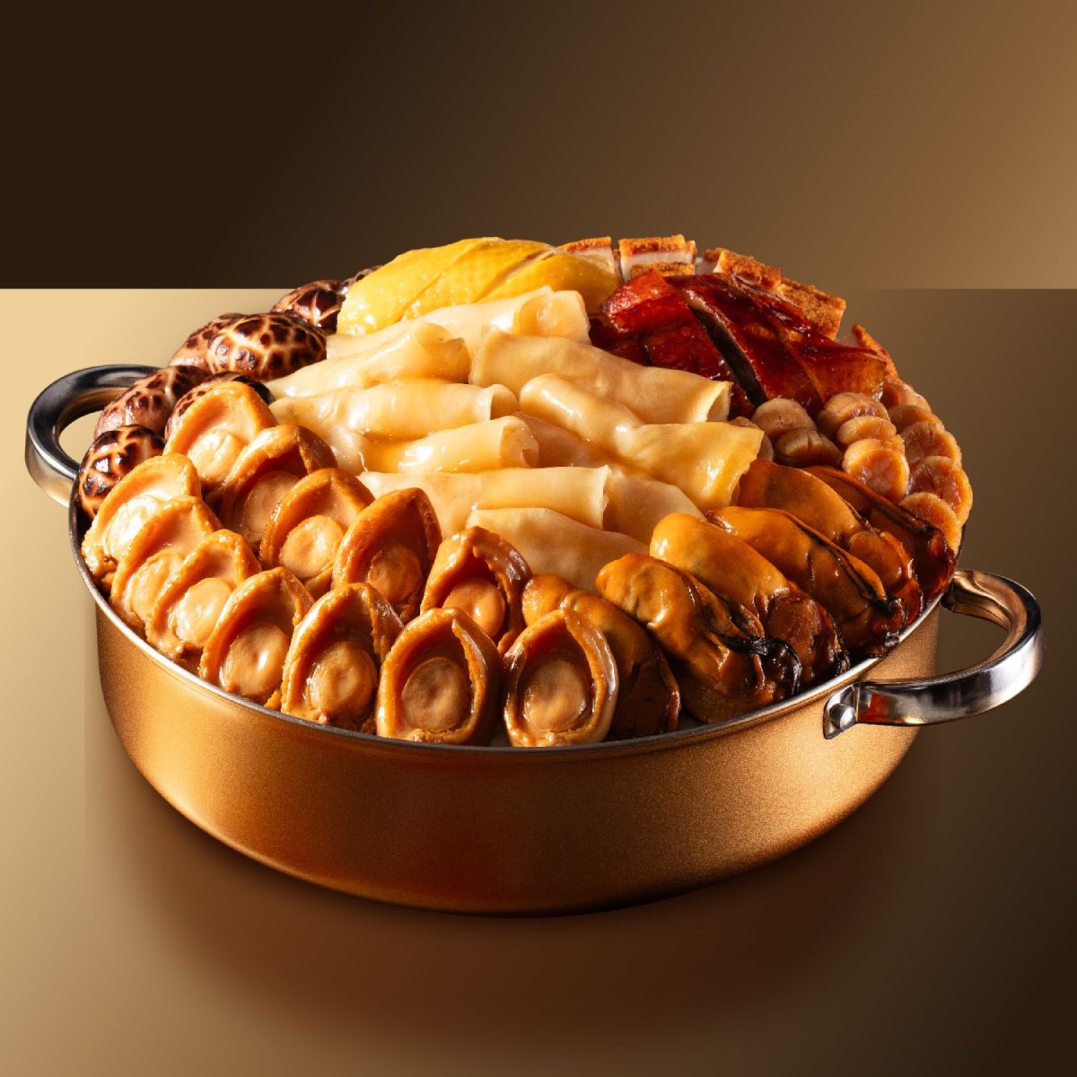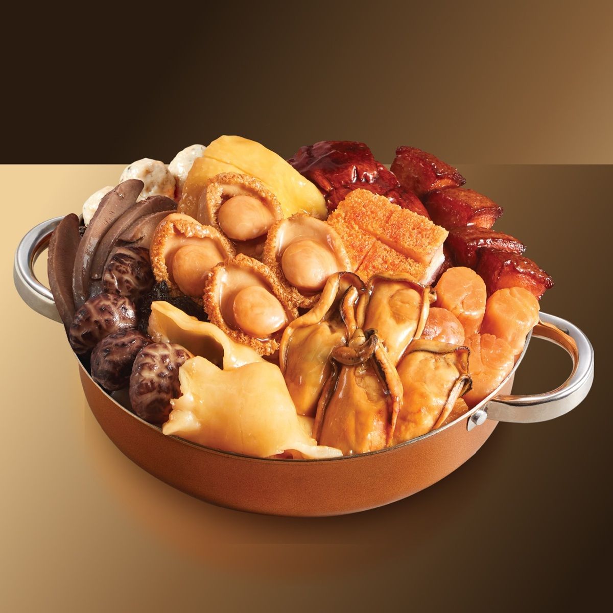 食材包括: 原隻鮮鮑魚、特級蠔豉、元貝、貴妃雞、燒鴨、大紅燒肉、墨魚乾炆豬肉、鮑魚汁炆花膠、醬汁蓮藕、髮菜球、香滑鯪魚球、雞油花菇、滷水豬脷、南乳花生炆豬手、豬皮、枝竹