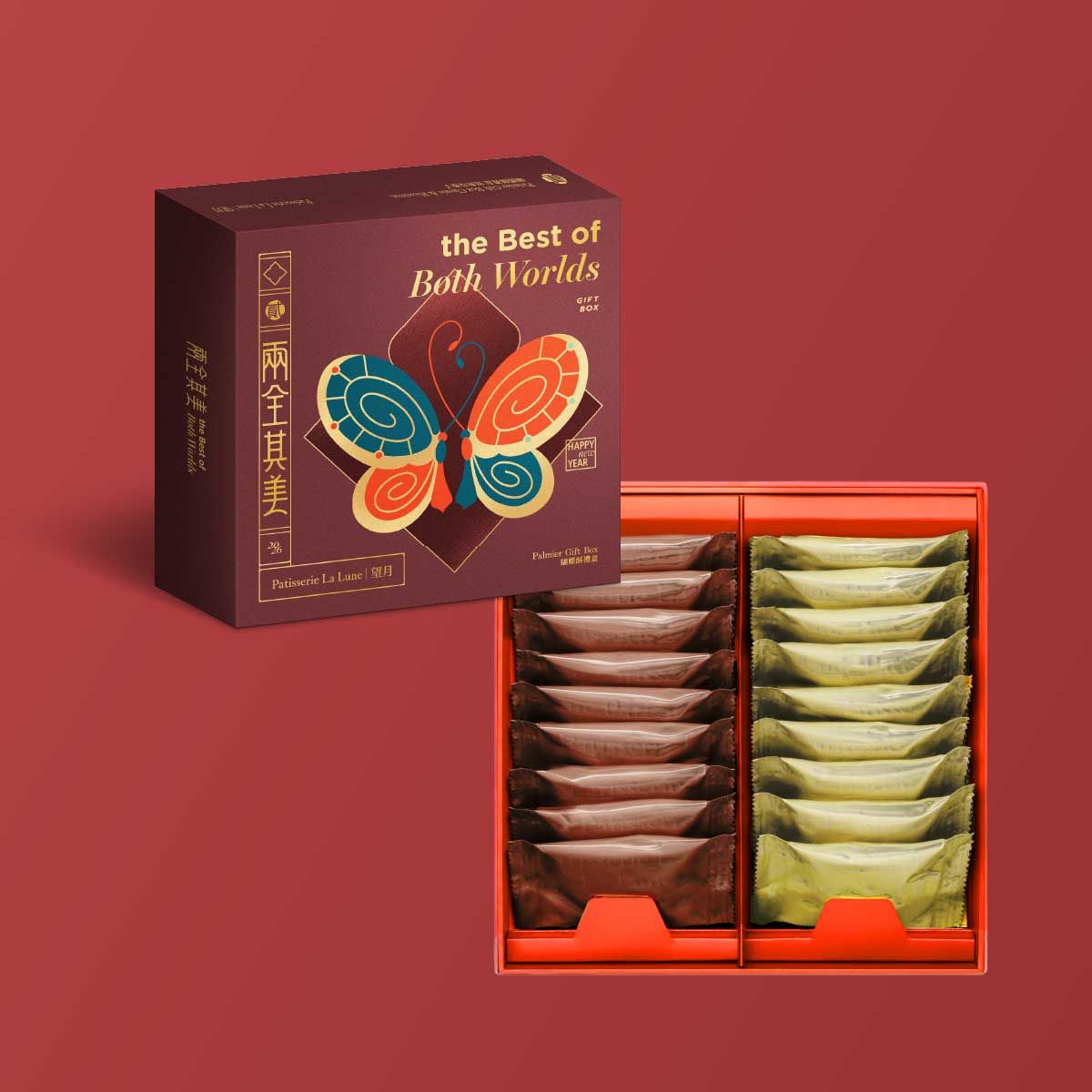 一個禮盒有齊望月經典蝴蝶酥 (9件)及榛子蝴蝶酥 (9件)兩款口味,一次過滿足饞嘴的快感。